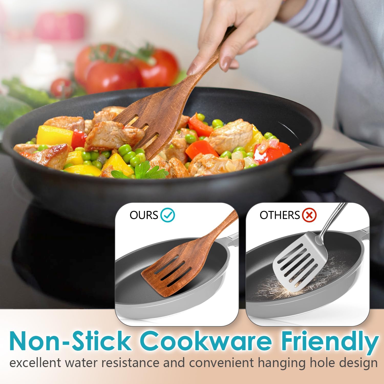 • 🌲【Nonstick Cookware Safe】These wooden utensils are perfect for use with nonstick cookware. Their smooth, natural finish will not scratch or damage your pots and pans, extending the life of your cookware. Unlike metal utensils, they are gentle on your nonstick surfaces, ensuring you can cook with confidence.
