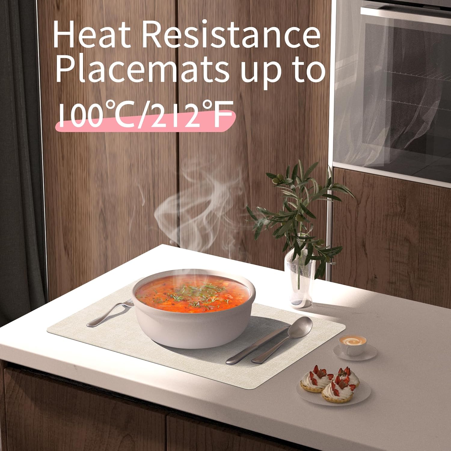 • HEAT RESISTANCE - UP TO 212 °F (100 °C): These quality dining table place mats are with 2mm thickness to protect your dining table from white heat marks. Each is sealed with a durable coating that is both stain and heat resistant to 212 °F