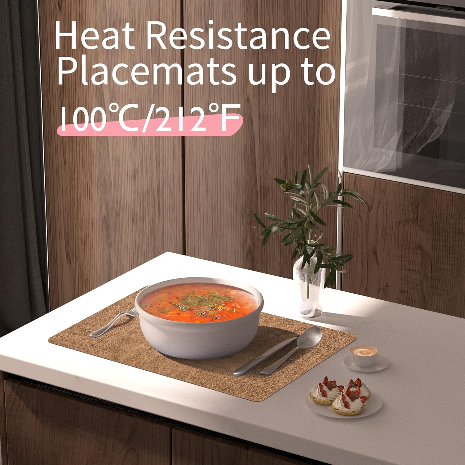 • HEAT RESISTANCE - UP TO 212 °F (100 °C): These quality dining table place mats are with 2mm thickness to protect your dining table from white heat marks. Each is sealed with a durable coating that is both stain and heat resistant to 212 °F