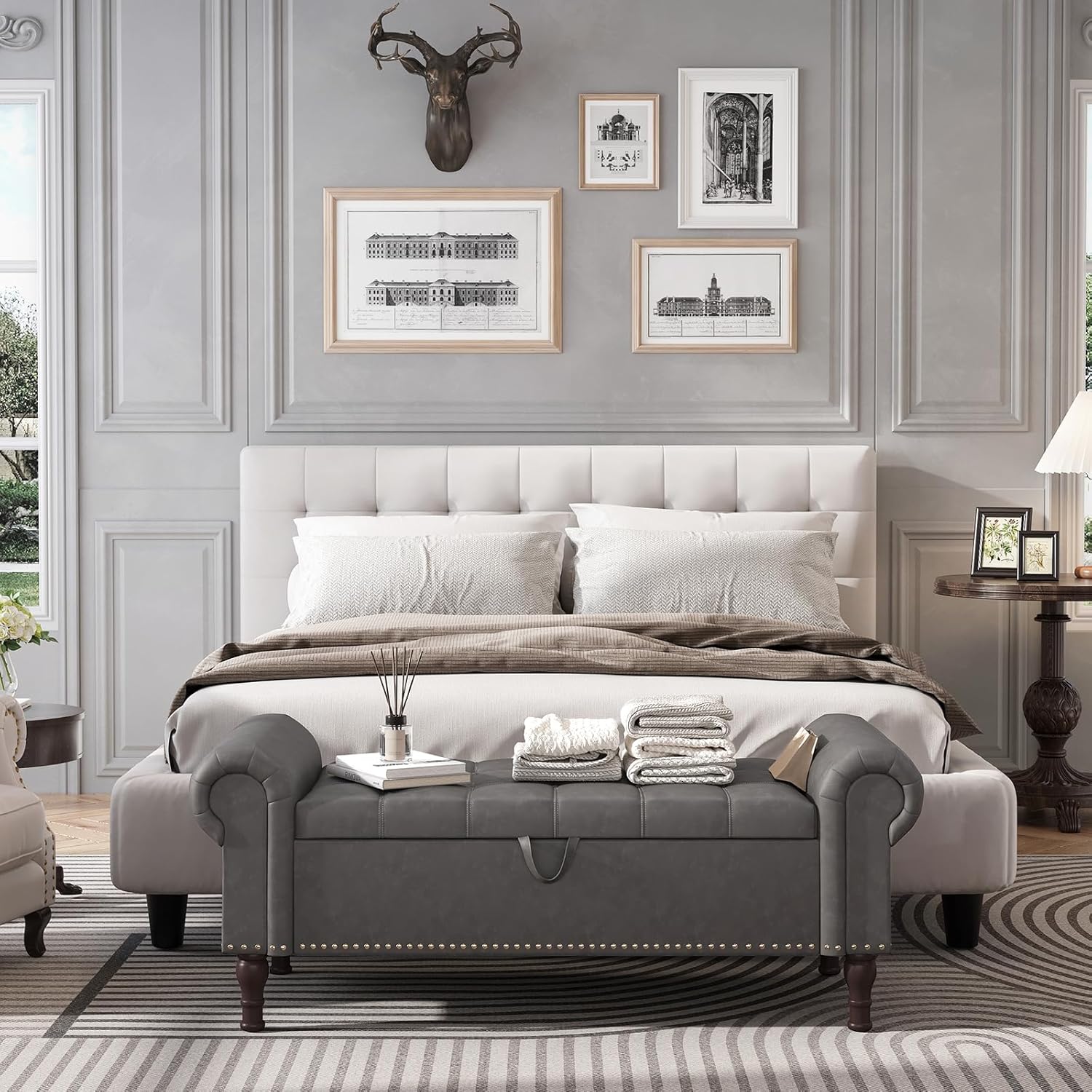 • 【ROLLED ARM & VINTAGE RIVETS】This bed bench blends Rolled Arm with Vintage Rivets, capturing the essence of a truly vintage piece. The button-tufted stitching on the lid enhances design of this end of bed bench. Simple lines provides a truly appealing look,feel and design. Perfect into a variety of styles of home scene.