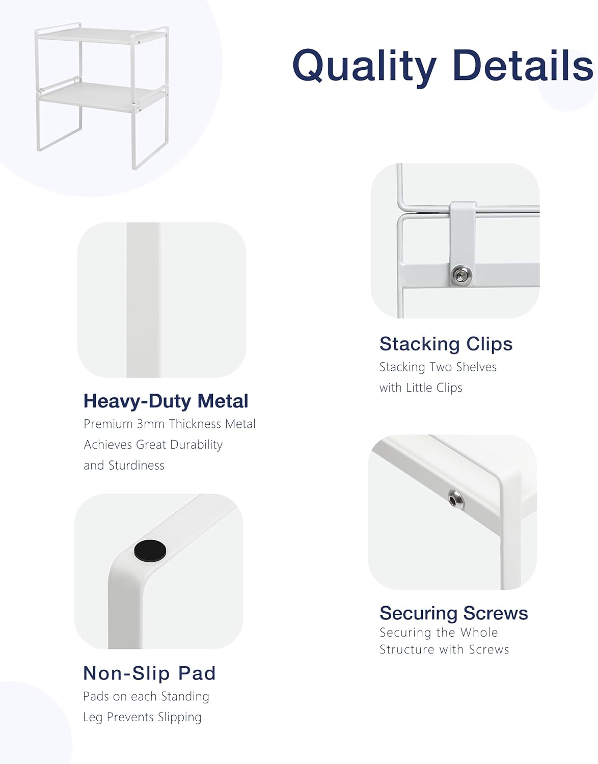 Nxconsu 2Pack Cabinet Shelves Stackable Shelf Organizer Rack Riser for Kitchen Cabinet Pantry Cupboard Counter Countertop Home Organization Storage Space Saver Heavy Duty Metal Nonslip White Wide