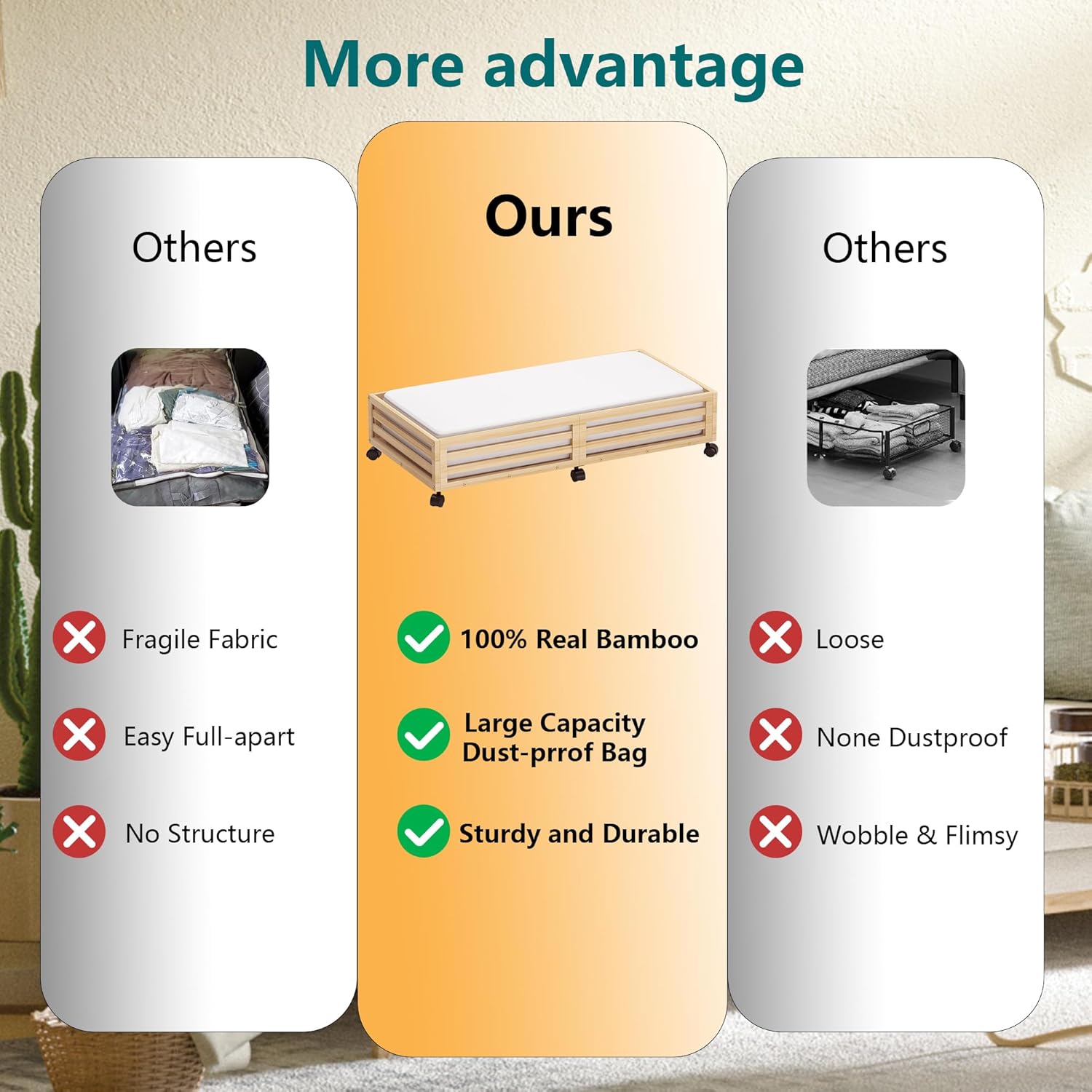 • ๐Ÿ‘[Sturdy and Durable] Our under bed storage with wheels is crafted from premium wood bamboo, boasting 4 rotating wheels and a capacity of 120lbs. This 'under bed storage' solution includes non-woven bags for efficient organization of clothes, books, shoes, and toys.