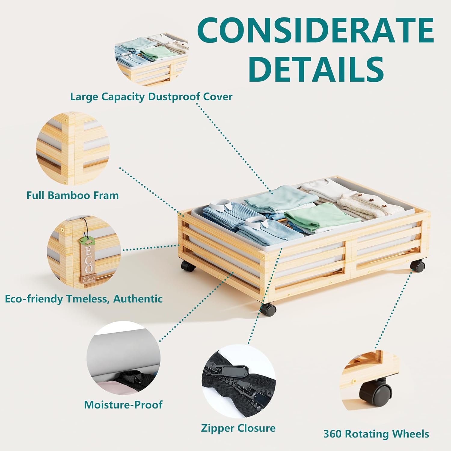 • ๐Ÿ‘[Sturdy and Durable] Our under bed storage with wheels is crafted from premium wood bamboo, boasting 4 rotating wheels and a capacity of 120lbs. This 'under bed storage' solution includes non-woven bags for efficient organization of clothes, books, shoes, and toys.