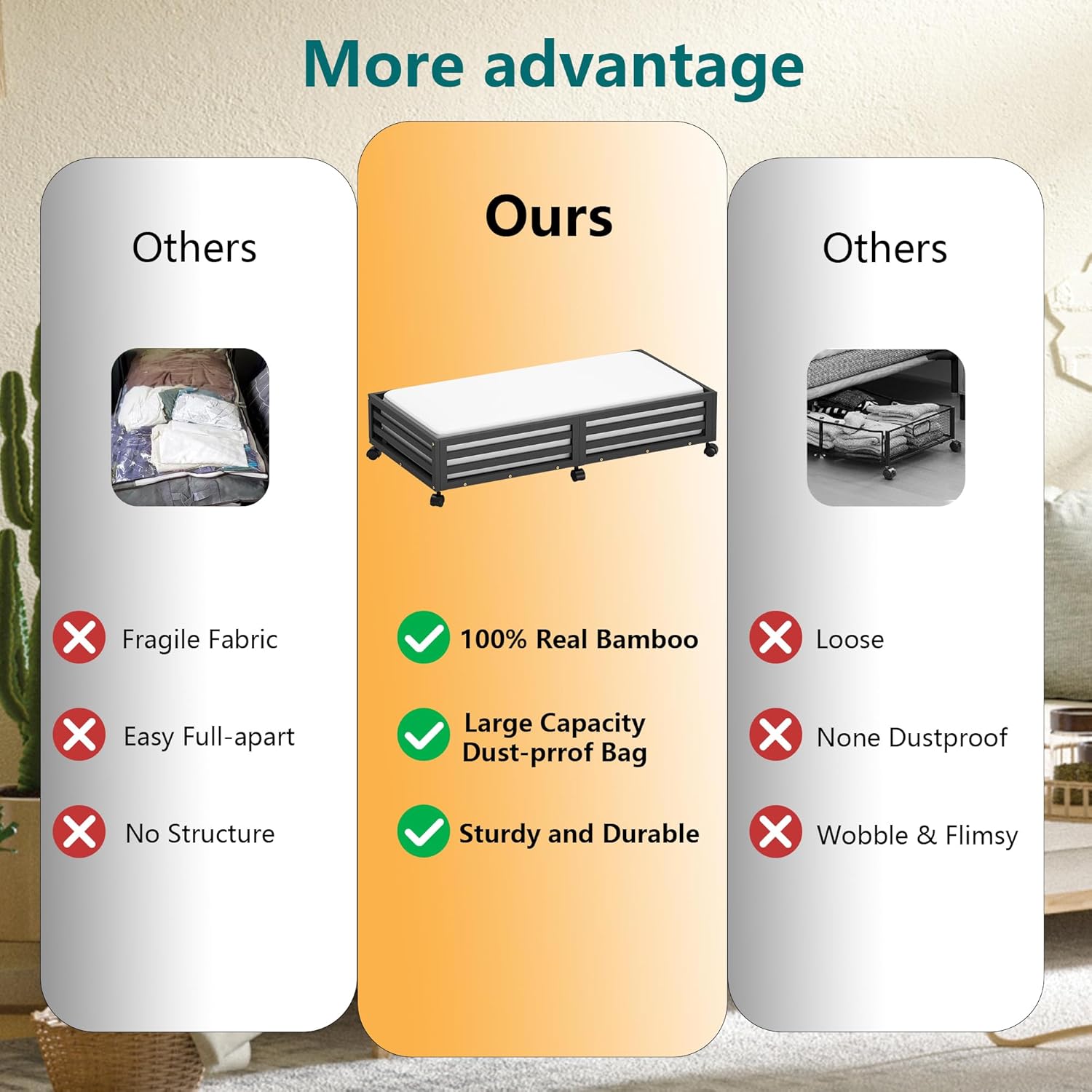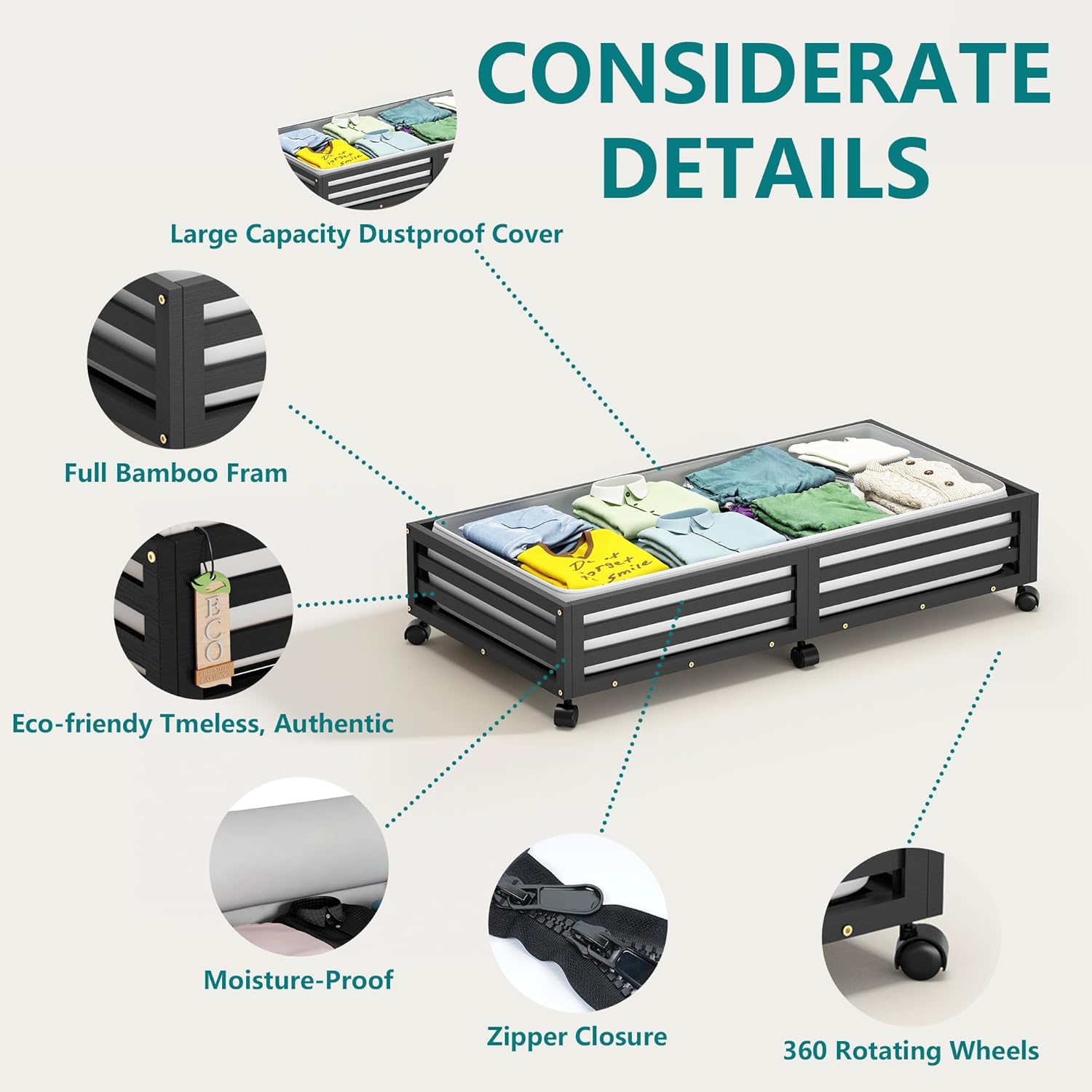 • ๐Ÿ‘[Sturdy and Durable] Our under bed storage with wheels is crafted from premium wood bamboo, boasting 4 rotating wheels and a capacity of 120lbs. This 'under bed storage' solution includes non-woven bags for efficient organization of clothes, books, shoes, and toys.