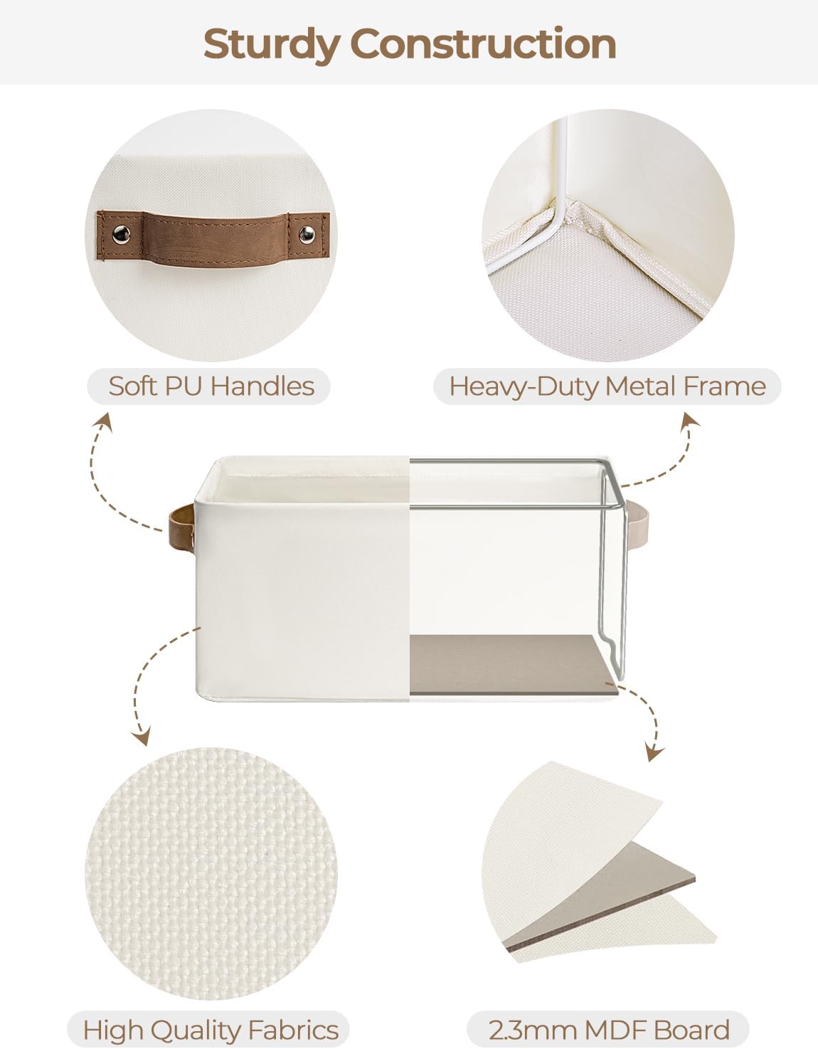 • Sturdy Structure: The fabric storage bin features metal frames supporting the top and sides, with a high-quality MDF base at the bottom, ensuring excellent overall structural stability.
