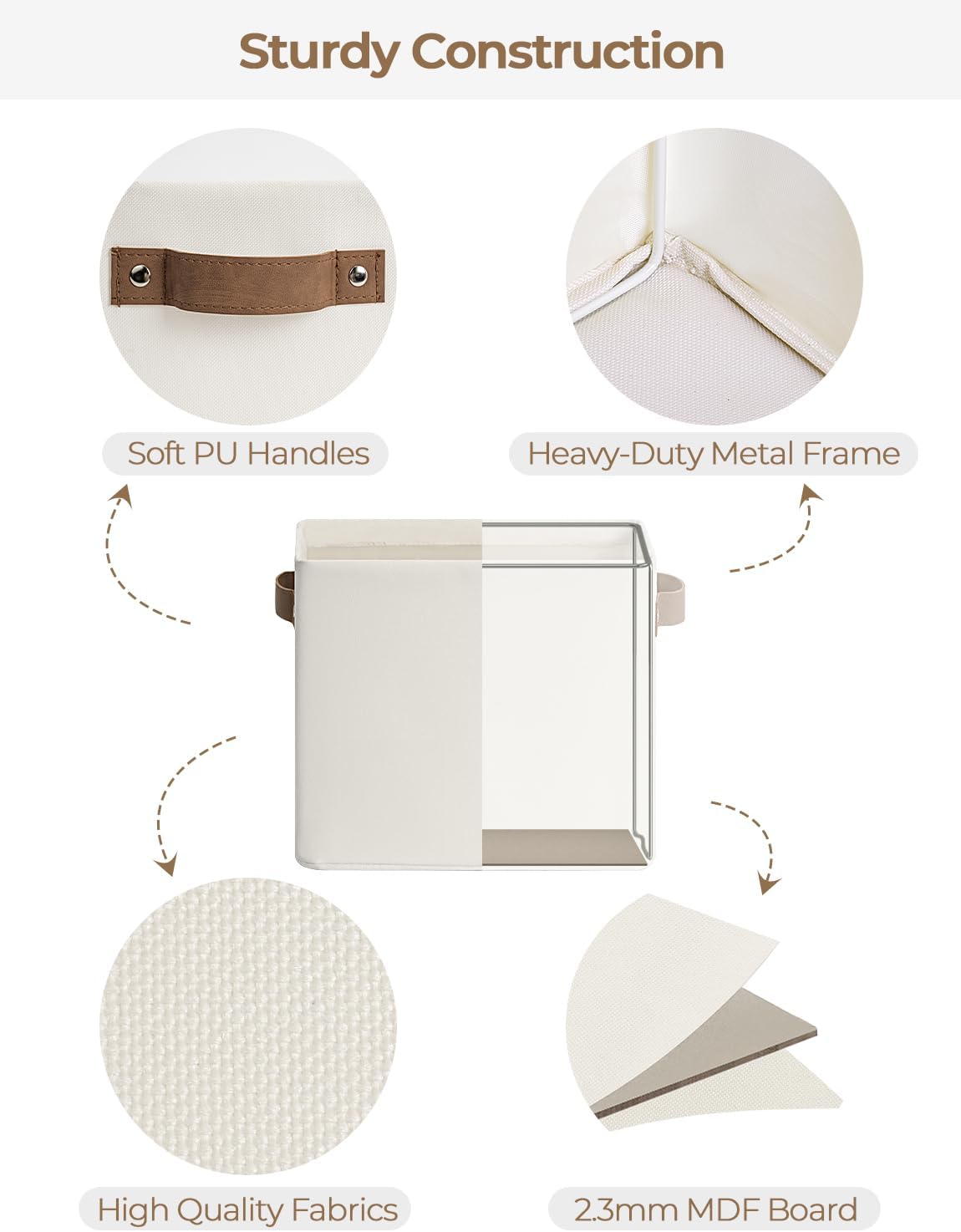 • Sturdy Structure: The fabric storage bin features metal frames supporting the top and sides, with a high-quality MDF base at the bottom, ensuring excellent overall structural stability.