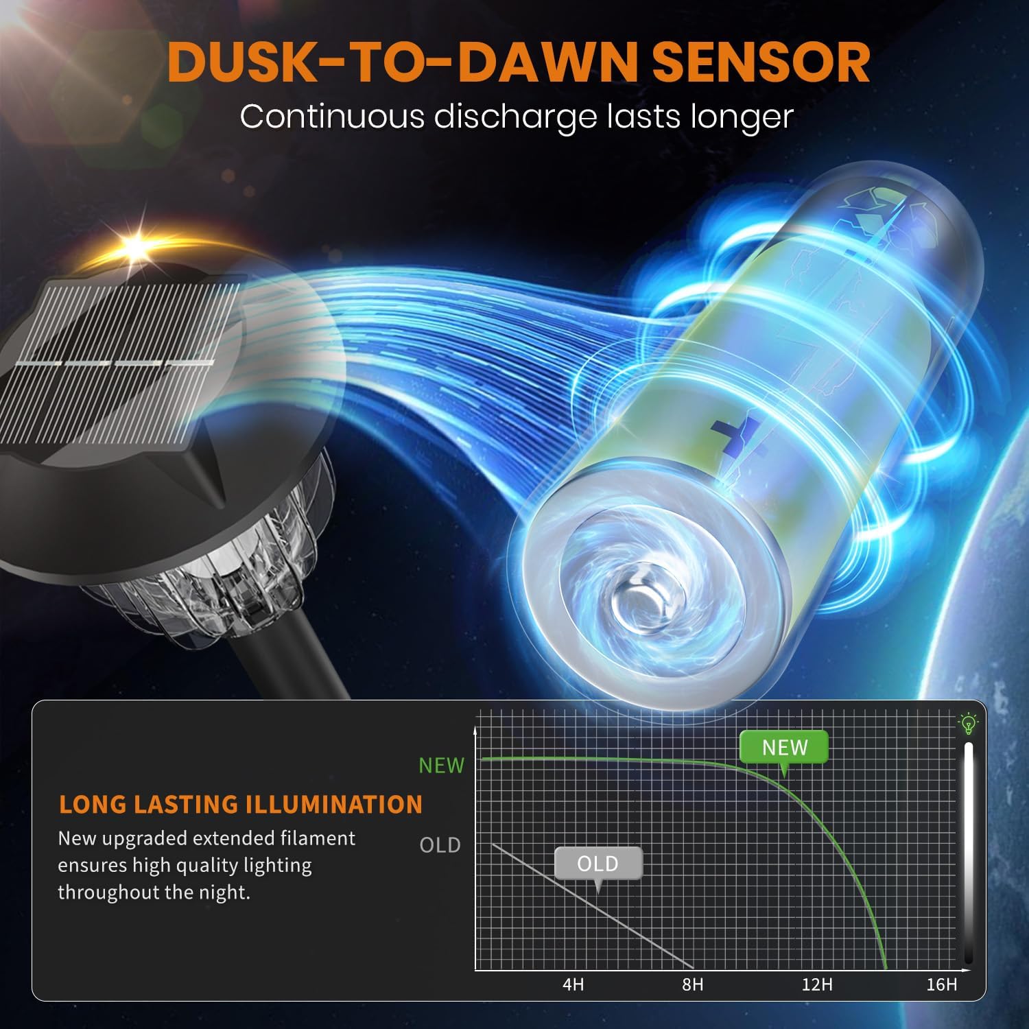 • SOLAR OUTDOOR LIGHTS: Our upgraded solar pathway lights draw inspiration from the cosmos, boasting a unique and durable construction. The sleek and modern design effortlessly complements the surrounding landscape, creating a lovely ambiance. Bringing a touch of magic to your garden and creates a warm and inviting atmosphere. Nice garden decor.
