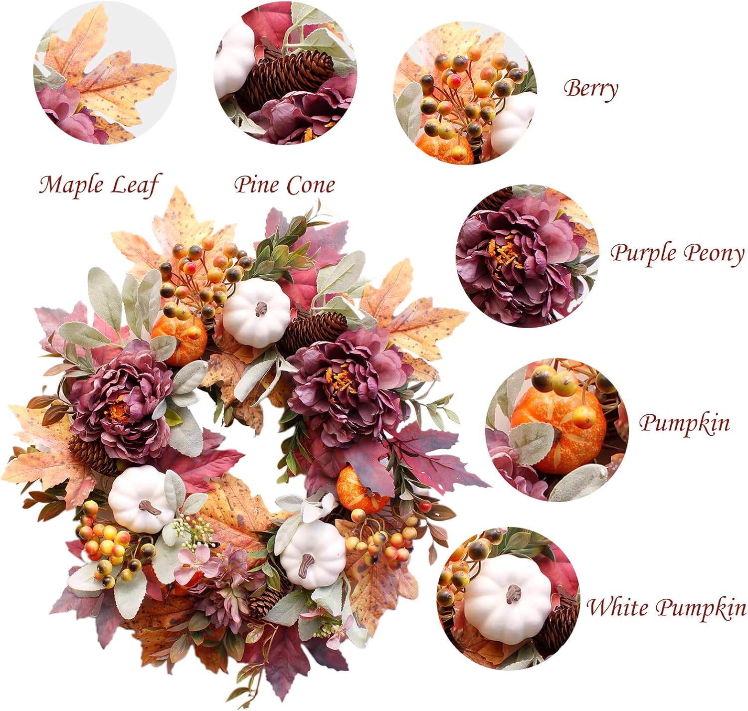 • 【Fall Wreath】- Our fall wreath for front door is handcrafted which is made of artificial white pumpkins,dark purple peony,pine cones and colorful maple leaves. The peony fall wreath is made of artificial silk flowers not plastic,which looks more realistic and bright.