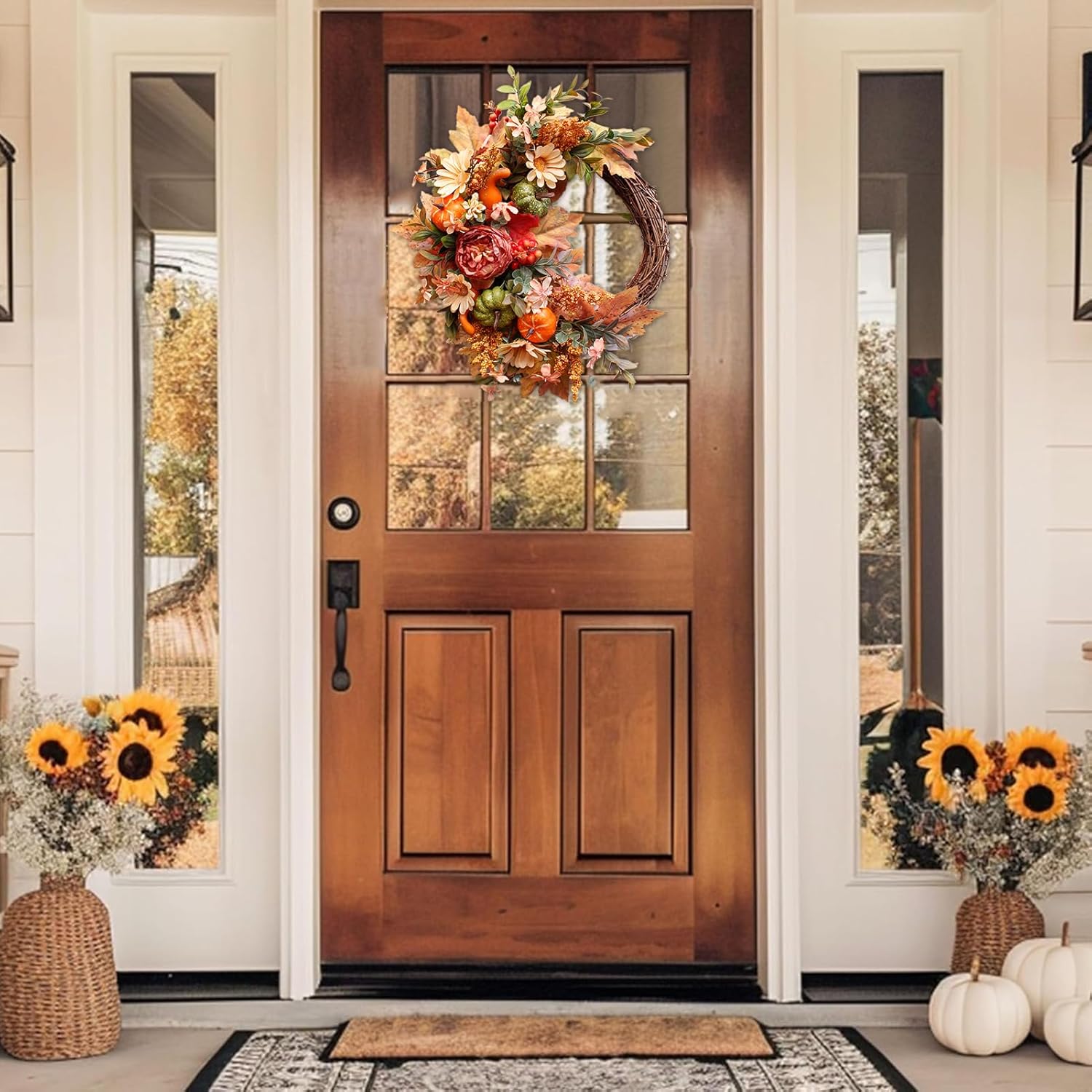 • 【Fall Wreath】- Our fall wreath for front door is handcrafted which is made of colorful pumpkins, peony, sunflowers and maples leaves .The fall floral wreaths is made of artificial silk flowers not plastic,which looks more realistic and bright.
