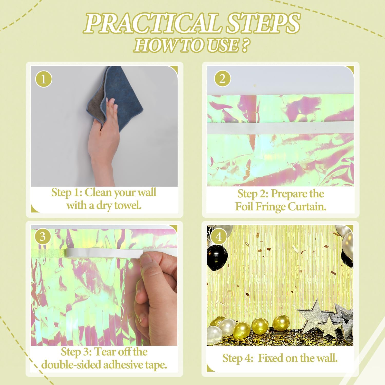 • 【Easy and Convenient Installation】These foil fringe curtains are easy to install and can be quickly hung on smooth surfaces using the included double-sided adhesive tape. No extra tools or materials required.