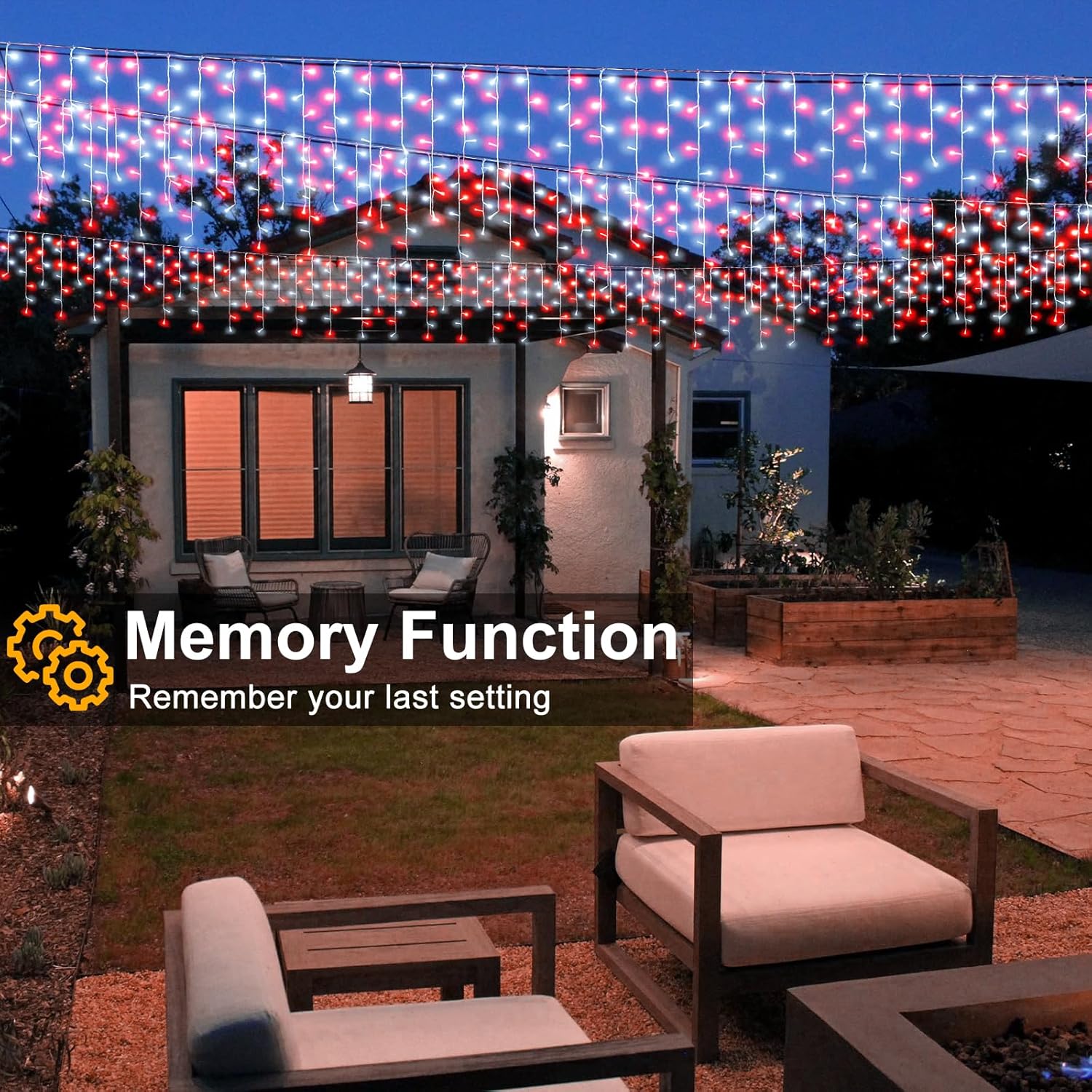 • Memory and Timer Function: The patio lights could recover from the previous setting mode when you restart, no need to reset the mode every time. Press and hold the button on the adapter for 3 seconds until the green light on, then the timer function start, 6 hours on 18 hours off. This smart and convenient icicle Christmas lights outdoor is the best choice for your holiday decoration.