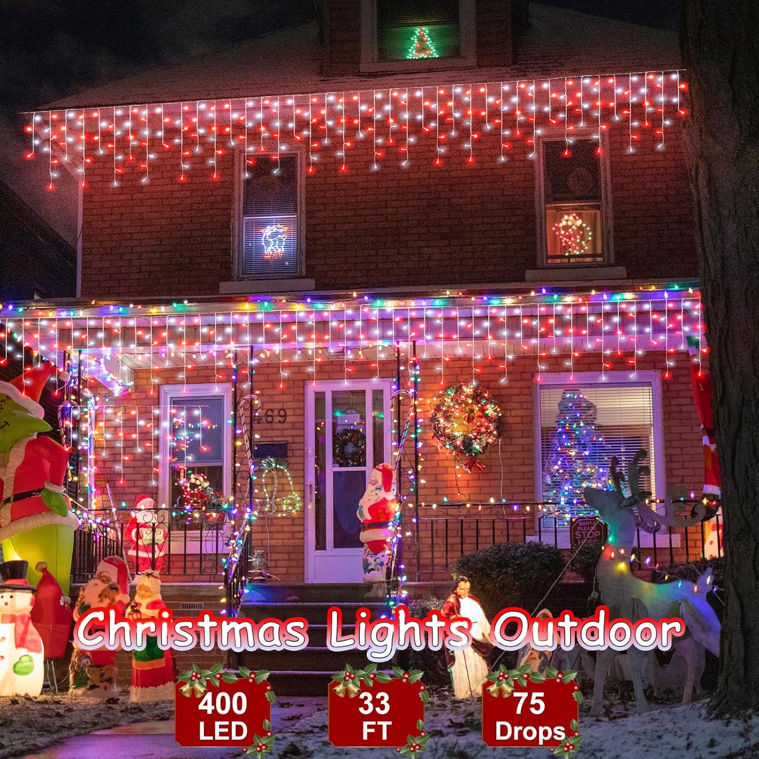 • Connectable Outside Christmas Lights: 400 pieces LED bulbs 32.8ft light length, each icicle light has end-to-end connection that allows up to 3 light strings connected together to meet your different decor needs. 9.84ft lead wire meant no need an extension cord, perfect twinkle lights for outdoor decoration.