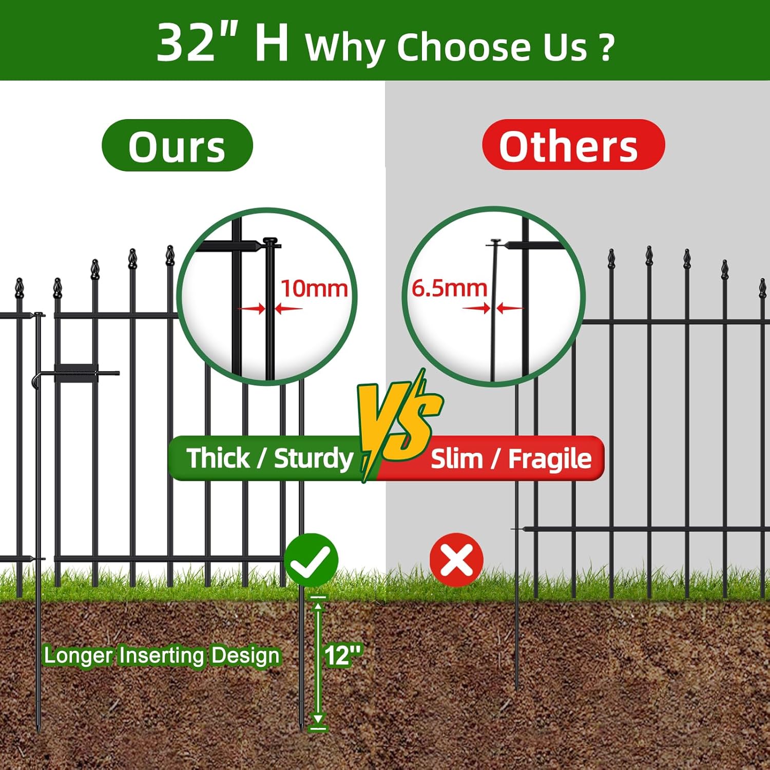 • WHAT'S INCLUDED: 1 Gate + 5 Panels + 7 Stakes in a bundle. Gate sized 31”(H) x 24”(W), each Fence Panel sized 32"(H) x 24"(W), each stake height 37.5 inch, the linear length 12 feet, Black color.