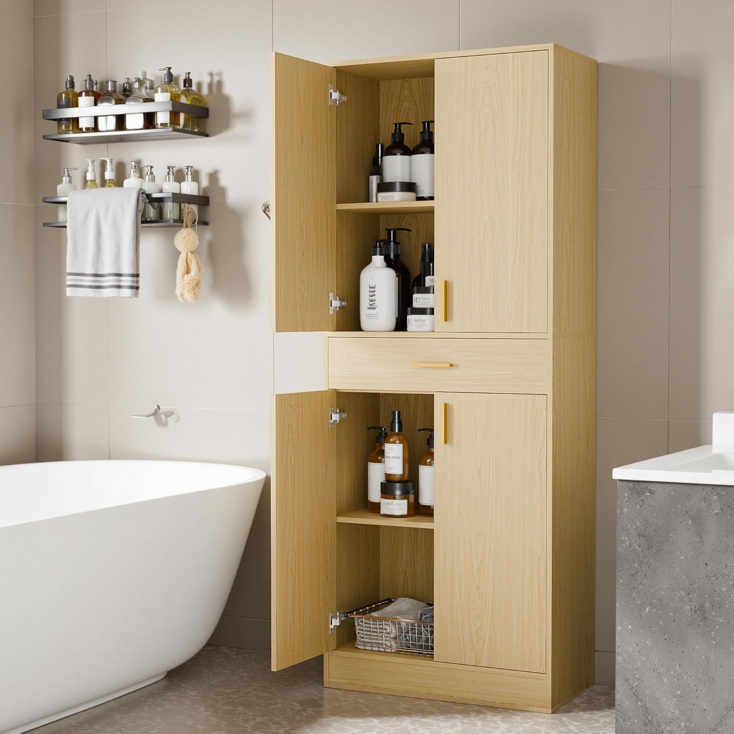 Cozy Castle Pantry Cabinet, 71" Tall Kitchen Storage Cabinet with Doors and Shelves, Freestanding Wood Cupboard Utility Hutch with Drawer for Dining Room Living Room Bathroom Furniture, Oak