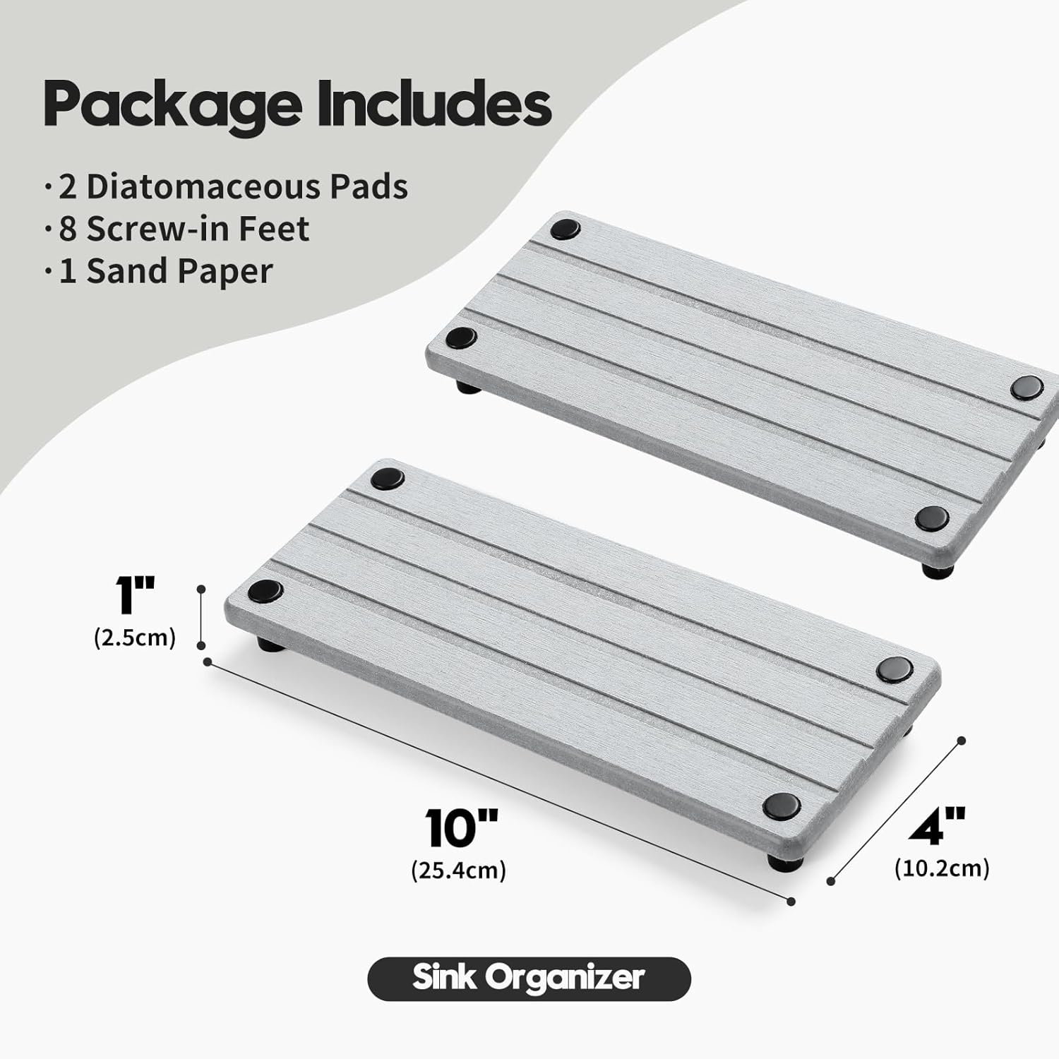 2 Pack Fast Drying Water Absorbing Diatomite Stone Mat Tray for Kitchen & Bathroom Counter - Instant Dry Sink Caddy Organizer - Vanity Holder for Soap, Sponge – Light Gray 10" x 4"