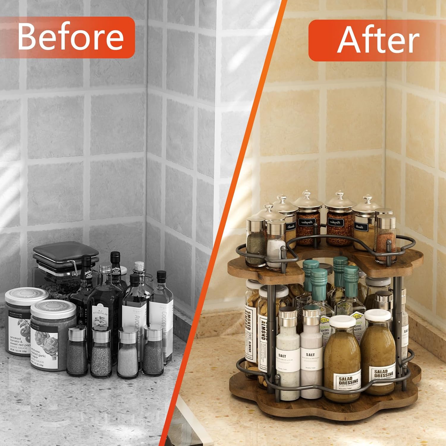 • 【Quality Materials】This 2-Tier Lazy Susan Organizer is made of vintage solid wood and metal and is very sturdy and durable. Unlike ordinary wood, it has a special coating that makes it waterproof and heat-resistant, so it can be used in a variety of scenarios and is much easier to clean.