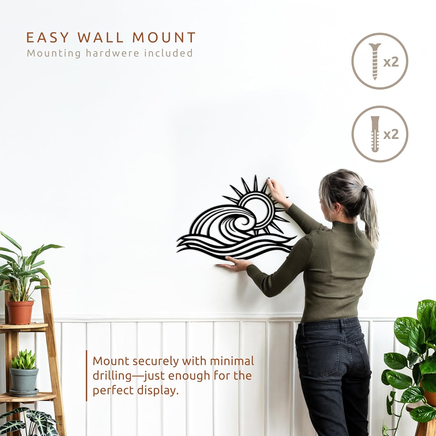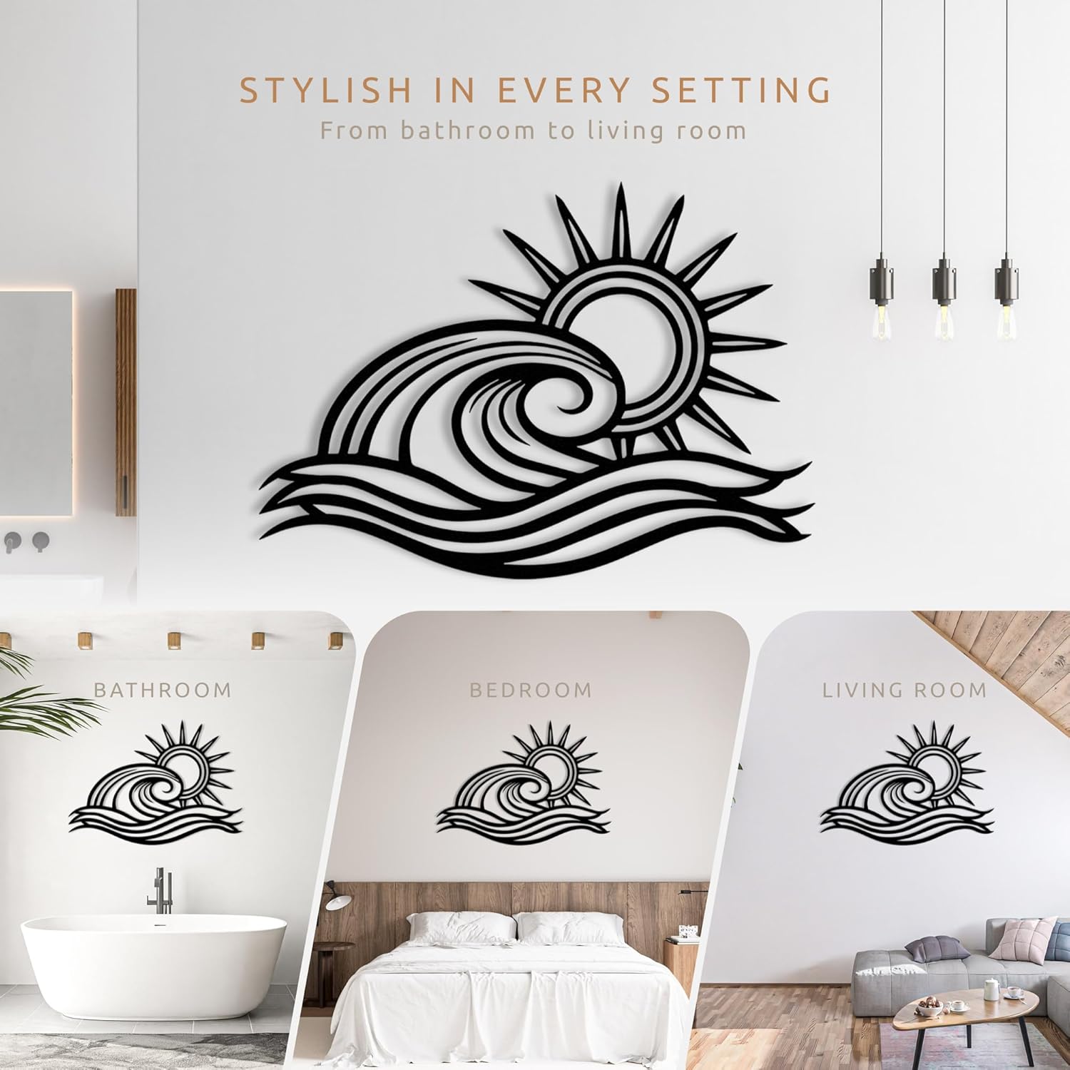 Wita Home Ocean Wave Metal Wall Art, Sun Beach Decor, Coastal Large Wall Sculpture for Home, Indoor/Outdoor Use, Nautical Wall Hanging, Eye-Catching Addition to Living Room (Black, 24 x 14 inches)