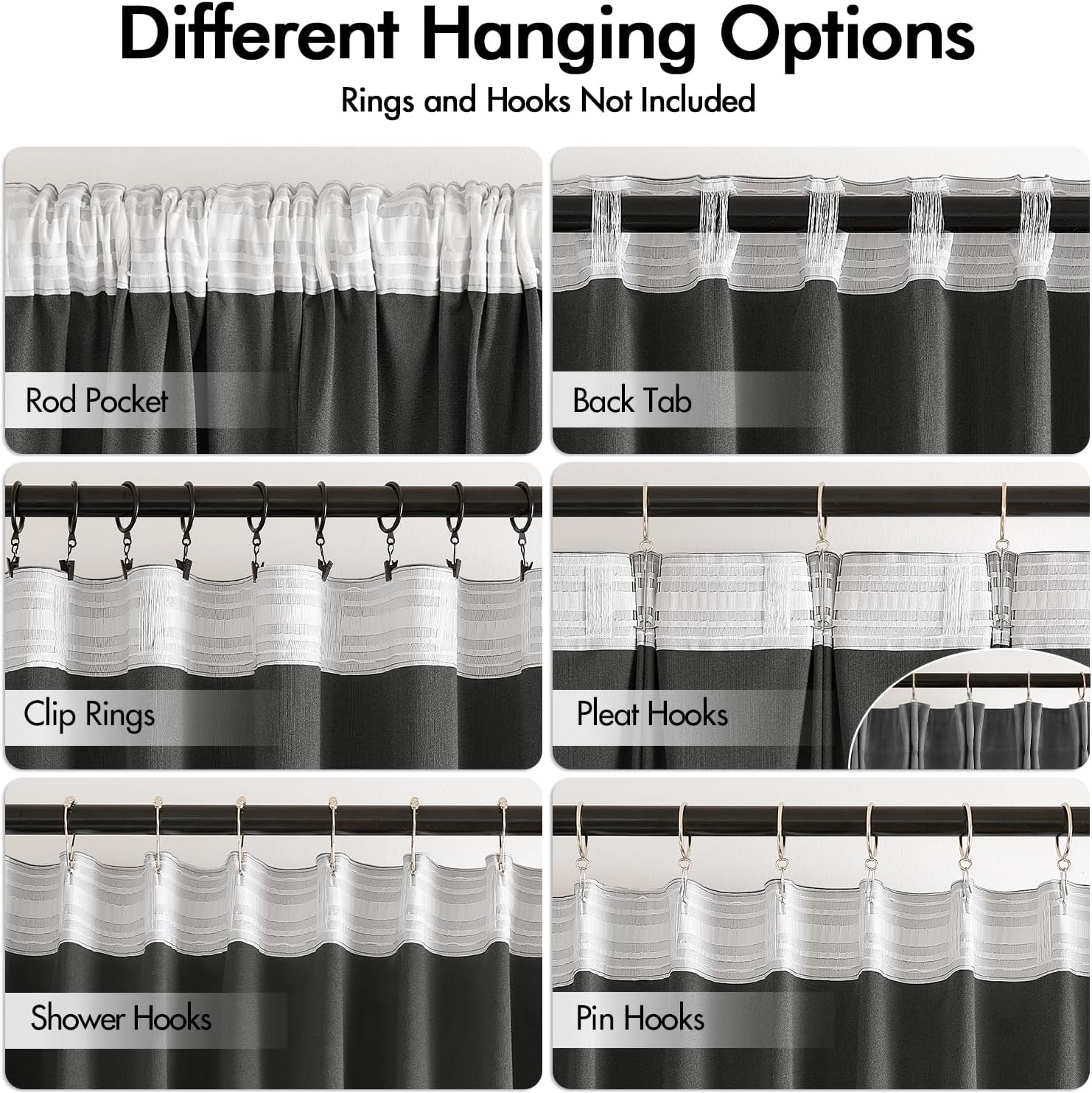 • HANGING OPTIONS: Each curtain panel has 3-in-1 top style design: rod pocket, back tab and pinch pleat. Back loop (2.3 inch) and rod pocket (3.1 inch) fit most standard rod. Curtains also can be hung with clip rings or curtain hooks. 3 ways to meet your various needs.