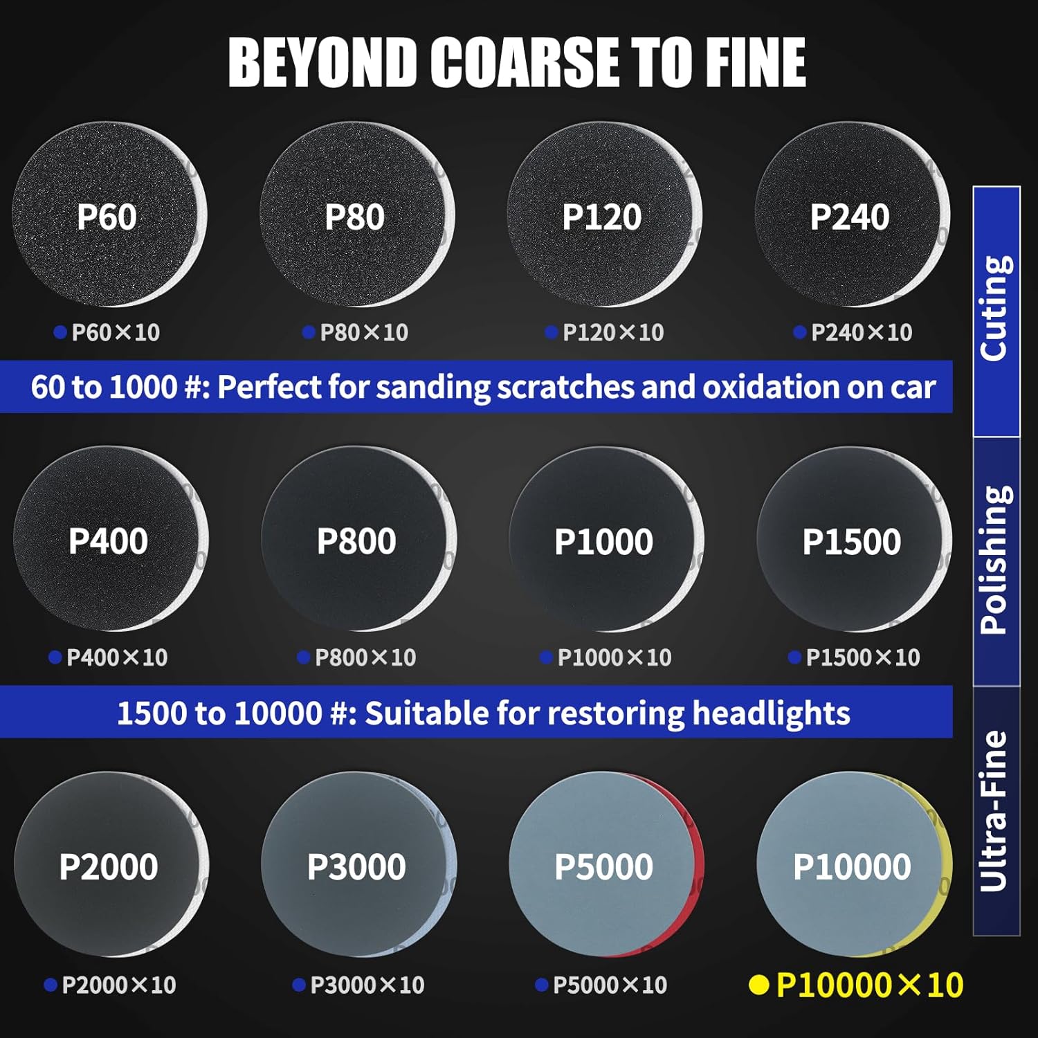 • Full-Cycle Sanding Support - The car drill polishing kit featuring 3 inch sanding discs range 60/80/120/240/400/800/1000/1500/2000/3000/5000/10000 grit sandpaper for dry and wet use, with orbital sander pads, imitation wool buffing pad, and upgraded backing pads for 1/4 and 1/8 inch shank. Seamlessly transition from sanding to polishing.