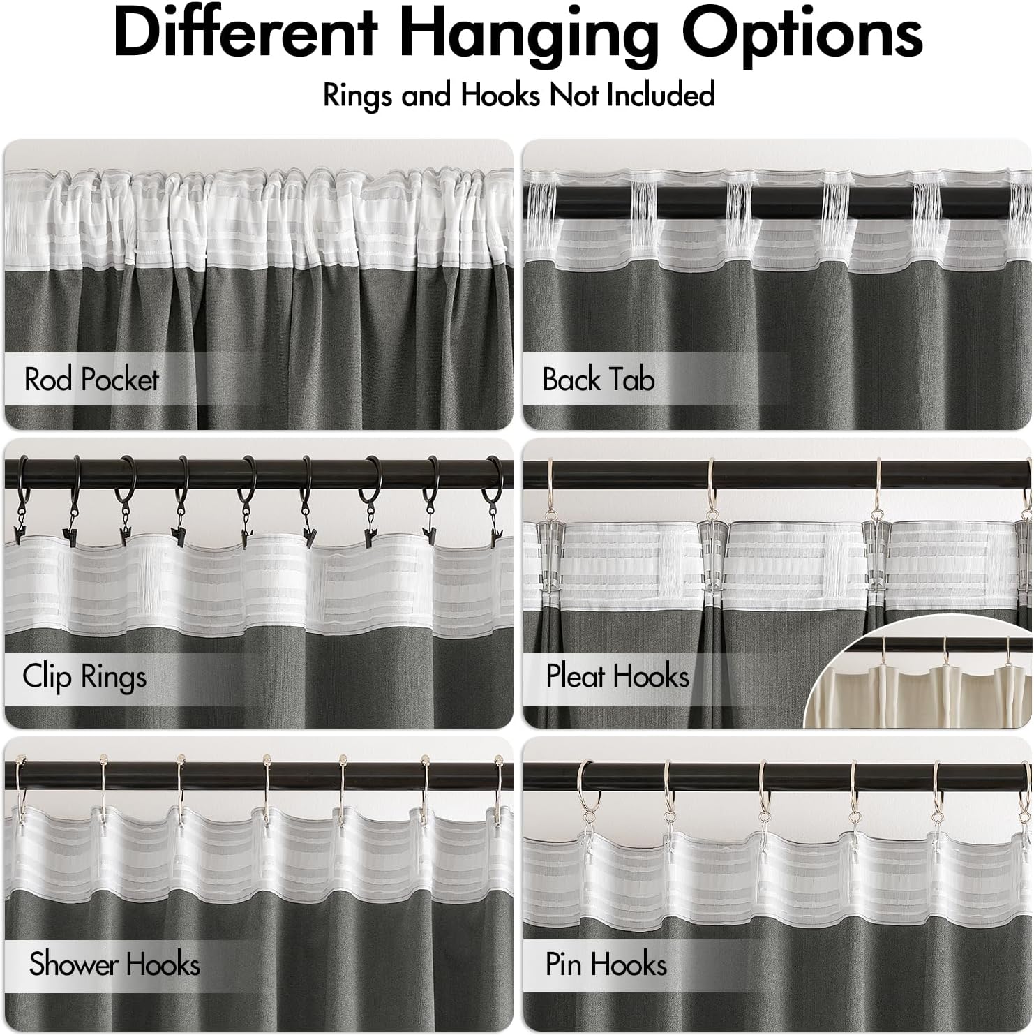 • HANGING OPTIONS: Each curtain panel has 3-in-1 top style design: rod pocket, back tab and pinch pleat. Back loop (2.3 inch) and rod pocket (3.1 inch) fit most standard rod. Curtains also can be hung with clip rings or curtain hooks. 3 ways to meet your various needs.
