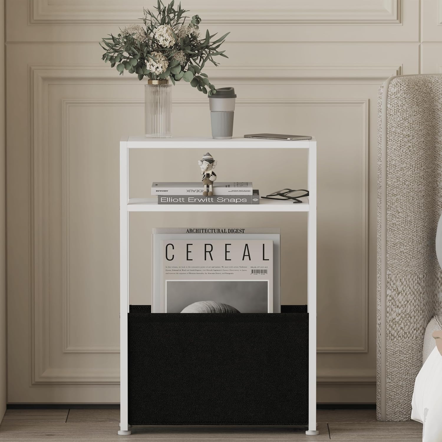 Narrow Side Table, Slim End Tables with Fabric Basket, Skinny Table for Small Spaces, Thin Bedside Table for Living Room, Bedroom, White, ZBZ01