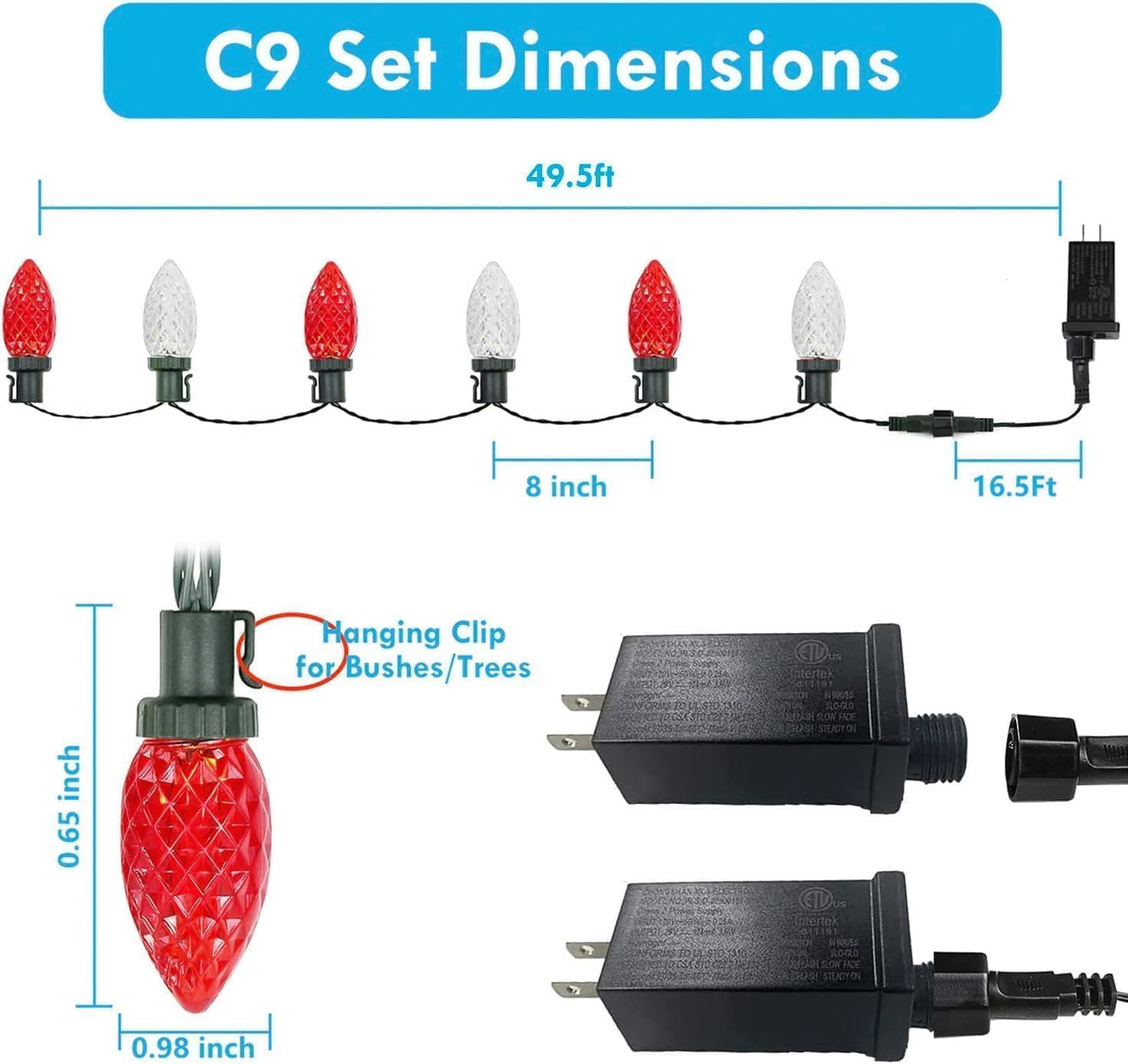 • C9 Led Christmas Lights for Outdoor & Indoor: Total length is 49ft, of which 33ft with lights. Super bright with new upgraded LED chips. These waterproof C9 Christmas string lights have red and white 50 LED bulbs to satisfy your diverse decorative effect.
