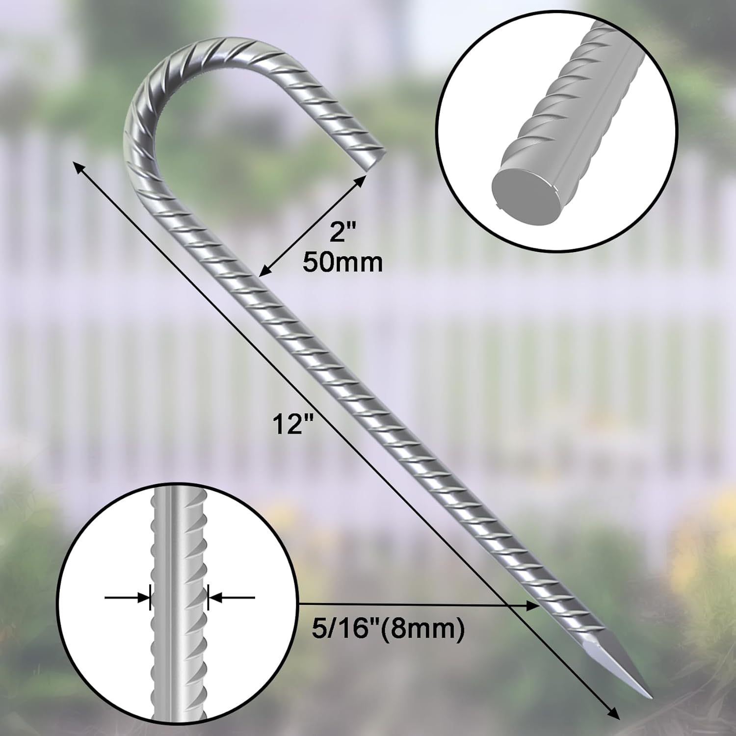 • Heavy Duty Rebar Stakes: Sold in bundles of 55, each 12-inch stake features a 5/16-inch (8mm) diameter J-hook design with 2-inch hook spacing. Perfect for securing chain link fences, outdoor decorations, greenhouses, canopies, gazebos, large inflatables, and more