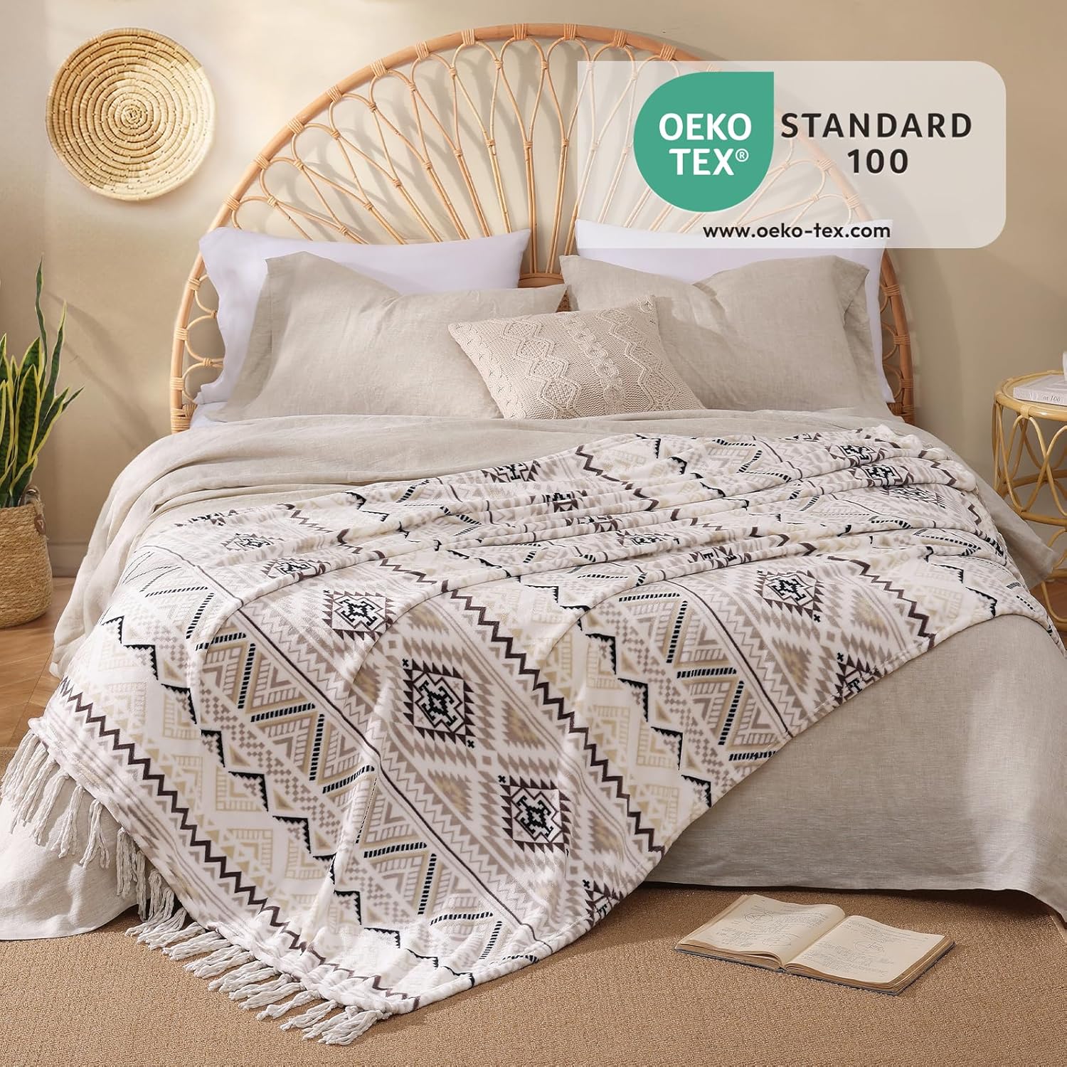 CASAAGUSTO Boho Throw Blanket - Beige and Gray Decorative Blankets with Tassel, Printed Flannel Bohemian Blanket for Chair, Bed, Sofa, Couch(60 * 80, Beige and Gray)