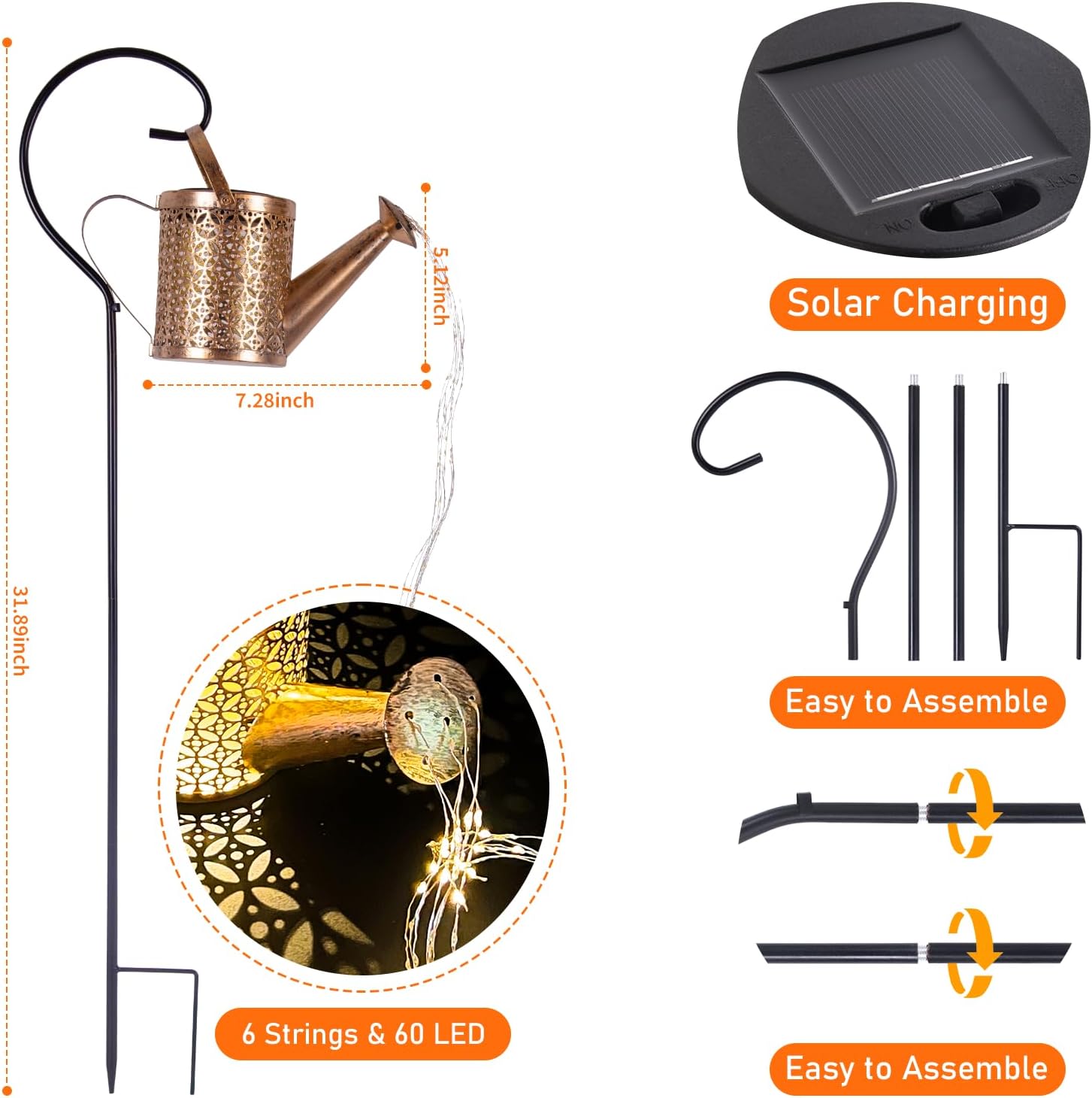 • Tool-Free Solar Watering Can Light: Installs in just 3 minutes with 3 simple steps: 1. Attach handle & hook 2. Insert into lawn 3. Hang the light. No wiring or external power needed.