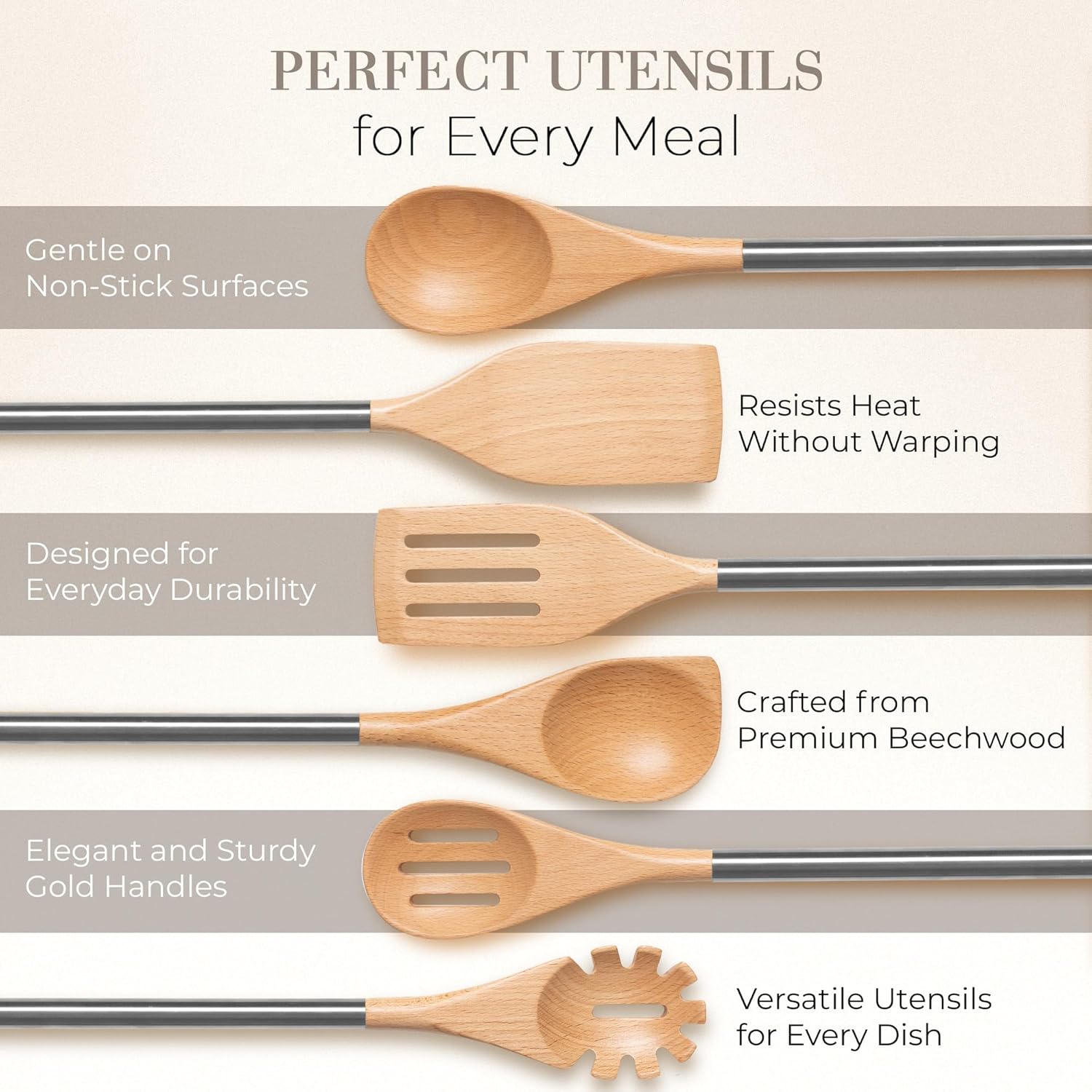 • BUILT TO IMPRESS, MADE TO LAST —Crafted from 100% beechwood with durable stainless steel handles, these wooden utensils for cooking are the perfect combination of elegance and durability. No cracks, no melting—just reliable tools that can take the heat. Plus, the natural wood grain adds a one-of-a-kind charm, making this wooden cooking utensils set as unique as your culinary creations.