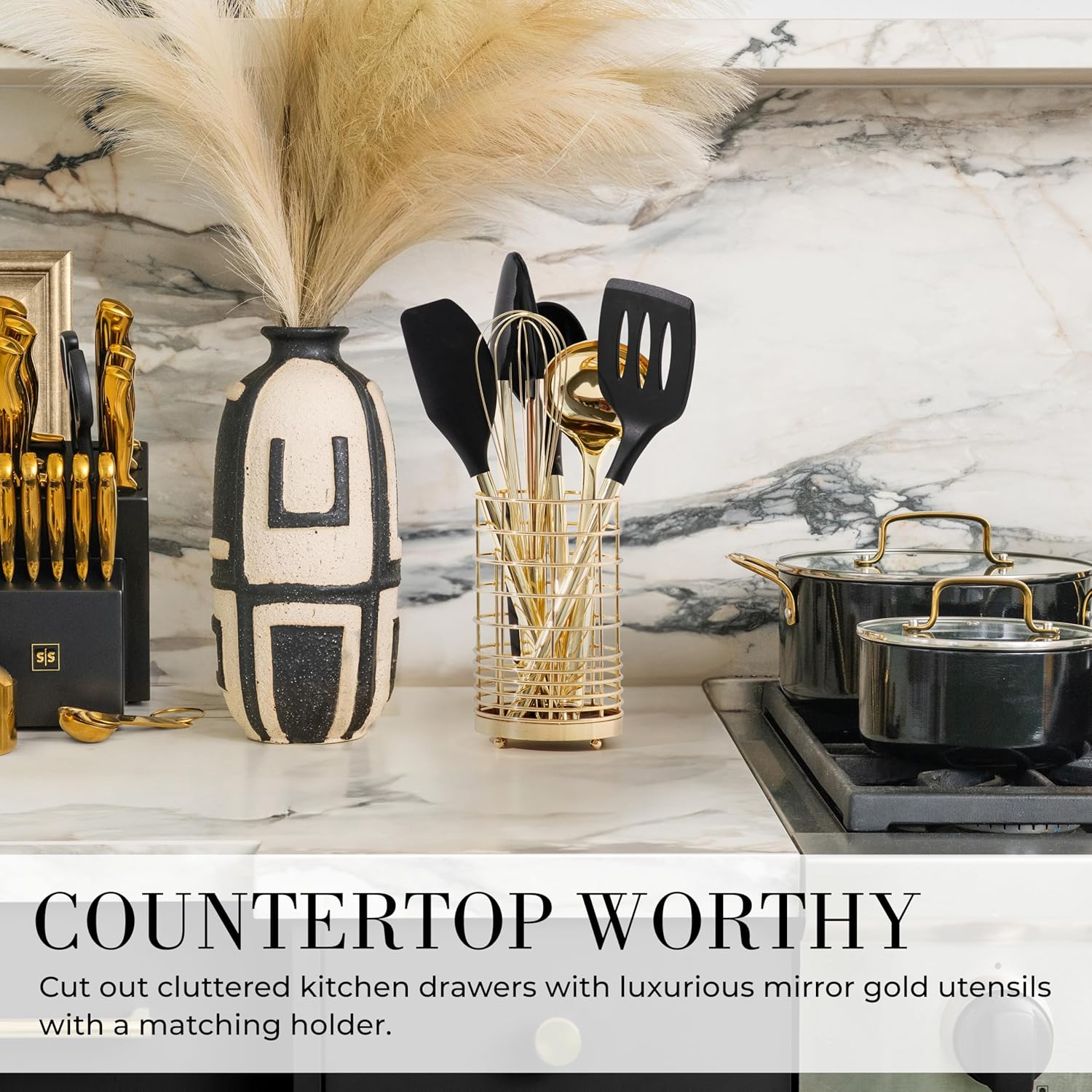 • BUILT TO LAST (AND TO IMPRESS) – No more scratched pans or melting tools! Our durable gold kitchen utensils are designed to be gentle on nonstick surfaces while standing up to high heat. This black and gold utensil set protects your cookware and makes every meal a masterpiece. And with a sleek matching holder, your countertops will be more organized (and glamorous) than ever. Get ready to show off your new black and gold utensils!