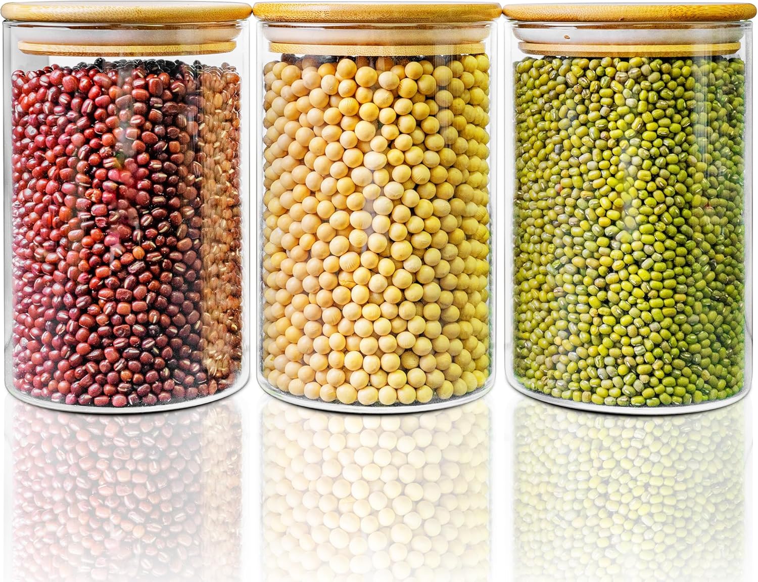 • [ Premium Glass Storage Containers with Lids Set of 3 ]: Premium glass jars with bamboo lids set have 3 pack 45 floz glass jars, and the size is 4.0 x 7.9 inch, great for pasta, coffee, oats, cereal, flour, sugar, rice, candy, cookies, nuts, teas, etc.The 45 oz glass jars with airtight lids are perfect to store food for maximum freshness and convenience in cabinet and pantry. With 4" wide mouth design, which can easily take out and refill with any type of foods