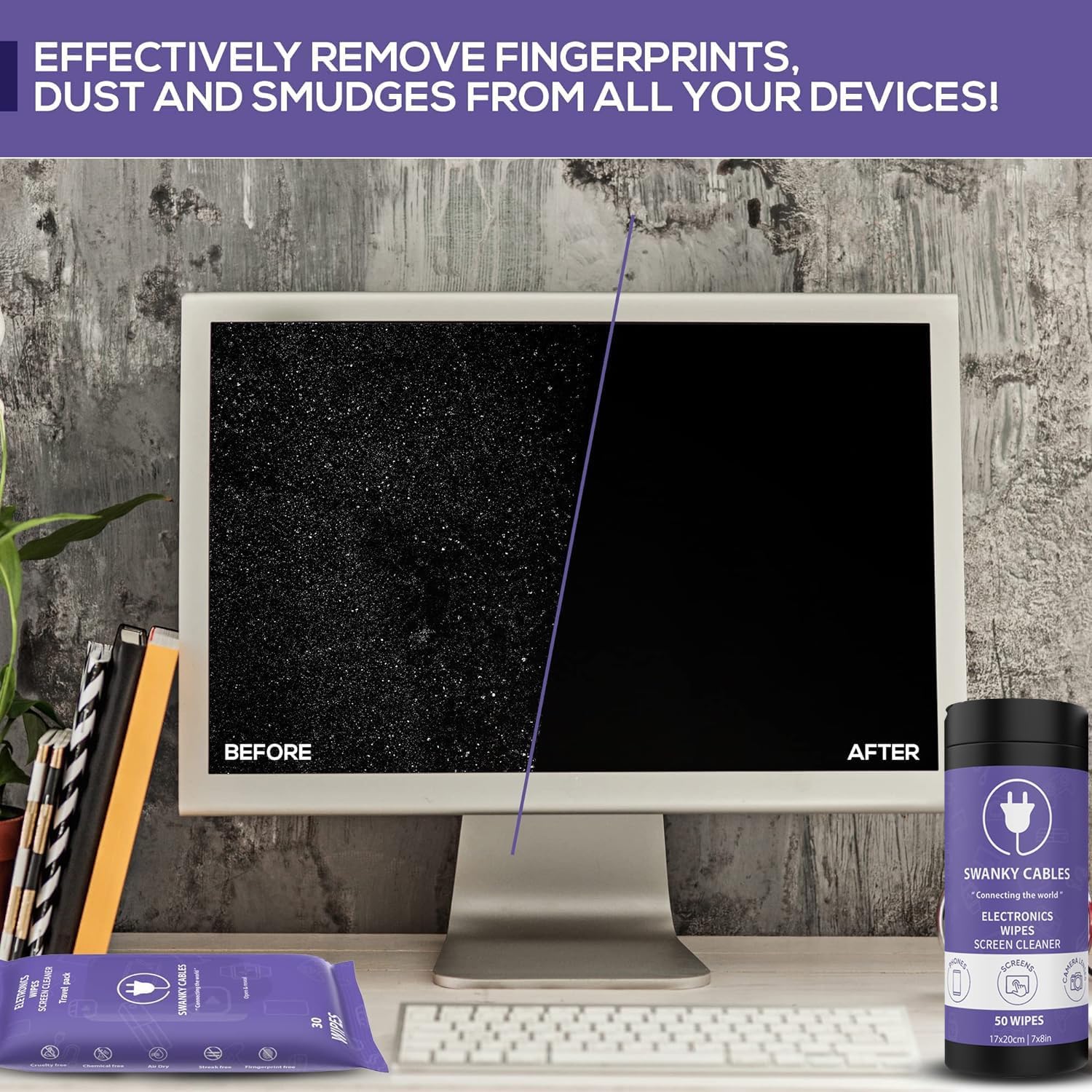 • VERSATILE SCREEN CLEANER - Swanky Cables Screen Cleaner Wipes offer a comprehensive cleaning solution for all your electronic devices. Ideal for TVs, laptops, phones, and monitors, these wipes effortlessly remove dust, smudges, and fingerprints, ensuring your screens are clean and clear.