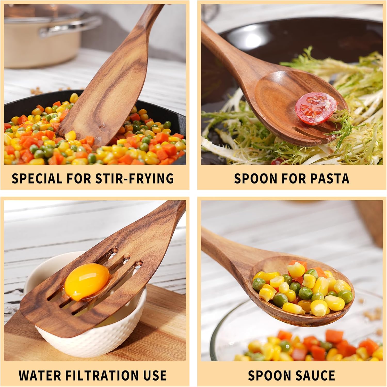 • NATURAL TEAK WOOD: Crafted from solid teak wood, our utensil set is 100% handmade and eco-friendly. It's durable and crack-free, unlike silicone or bamboo alternatives. Note: Natural wood utensils may have slight color variations.