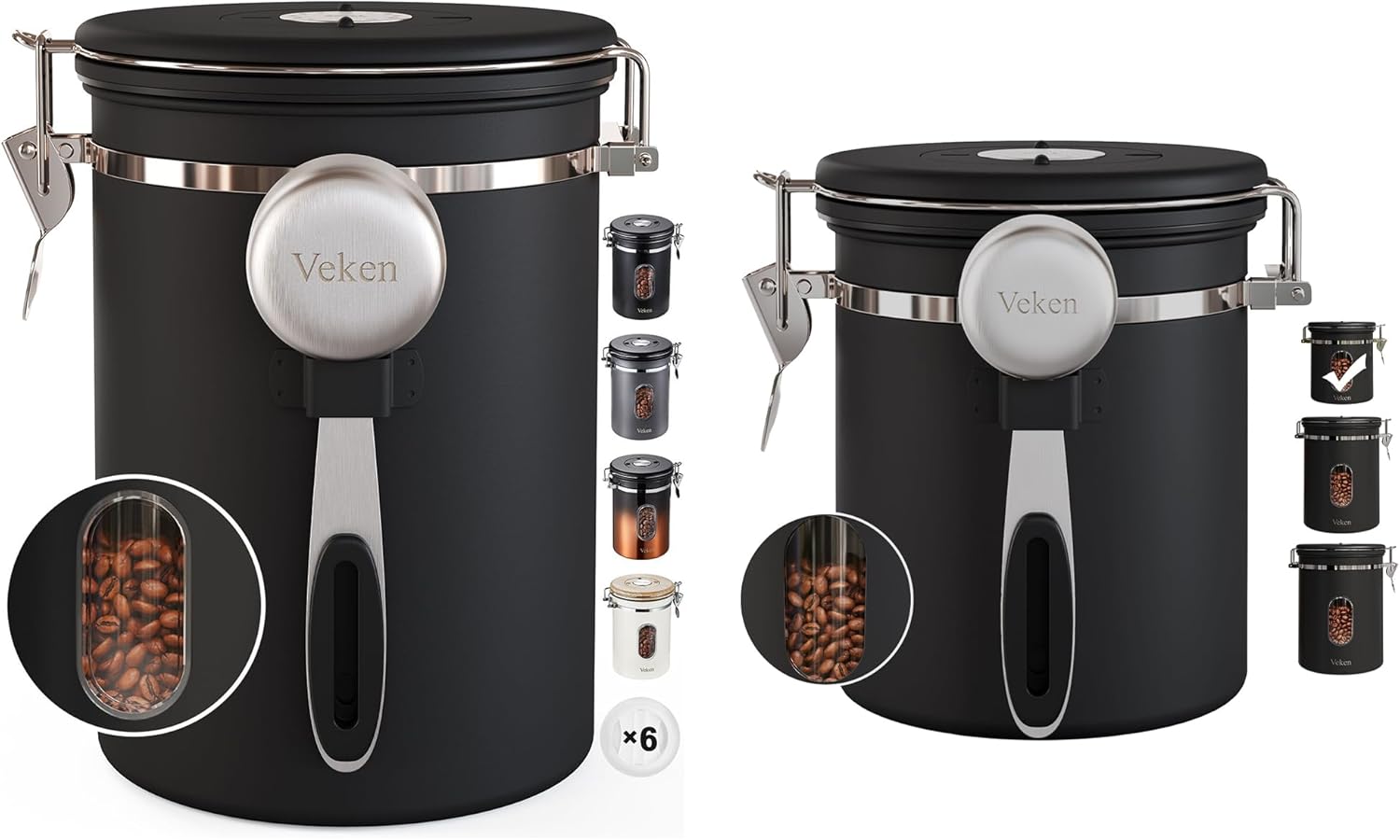 Veken Coffee Canister with Window, Airtight Stainless Steel Kitchen Food Storage Container with Date Tracker and Scoop for Grounds Coffee, Beans, Tea, Flour, Cereal, Sugar, 22&16OZ,Black
