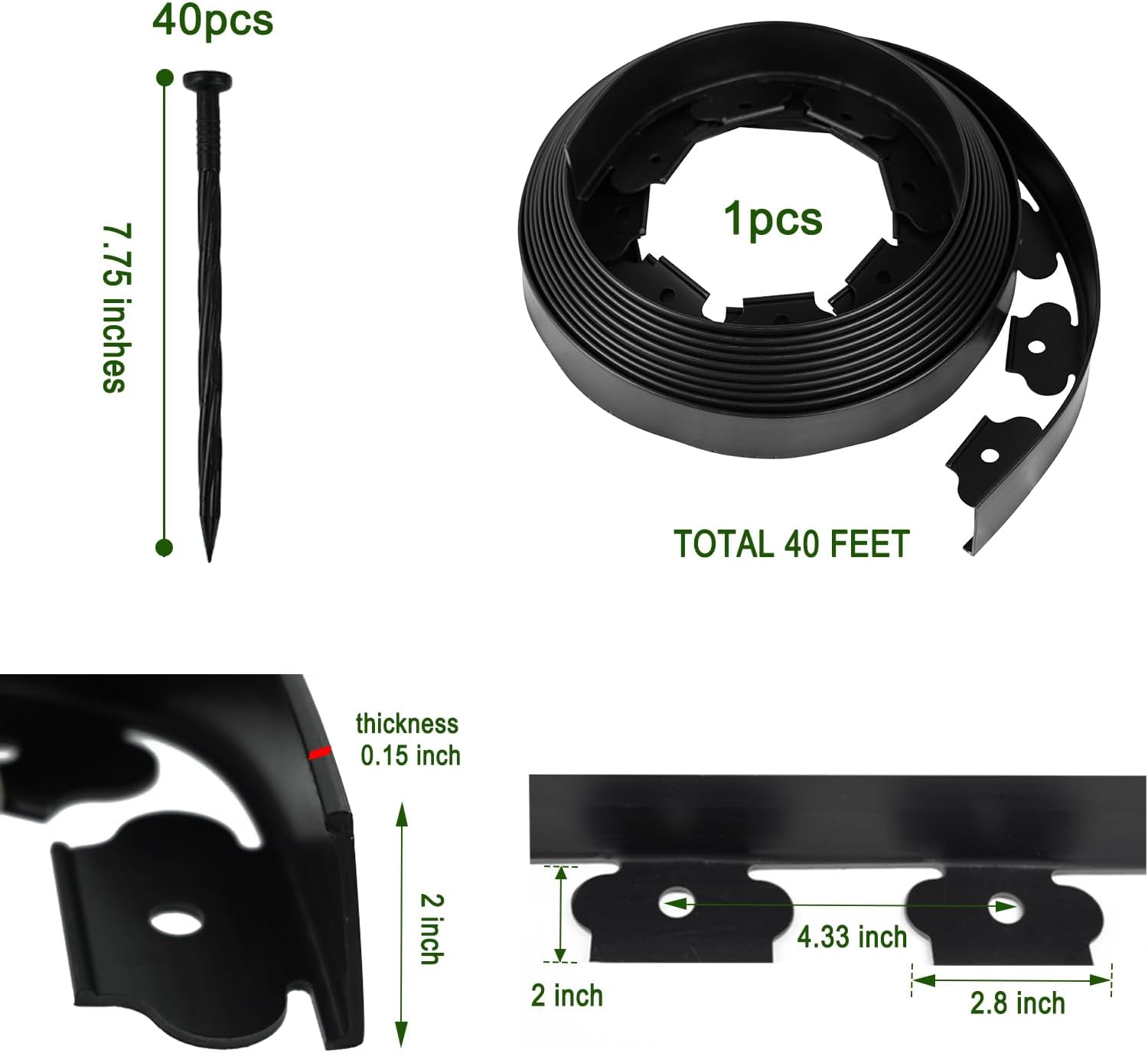 • Package Included: Lawn edging border offers 40 ft length landscape edging of 2 inches tall and 40 pcs (7.75 inches high) of upgraded plastic landscape stakes which are stronger, will not break easily