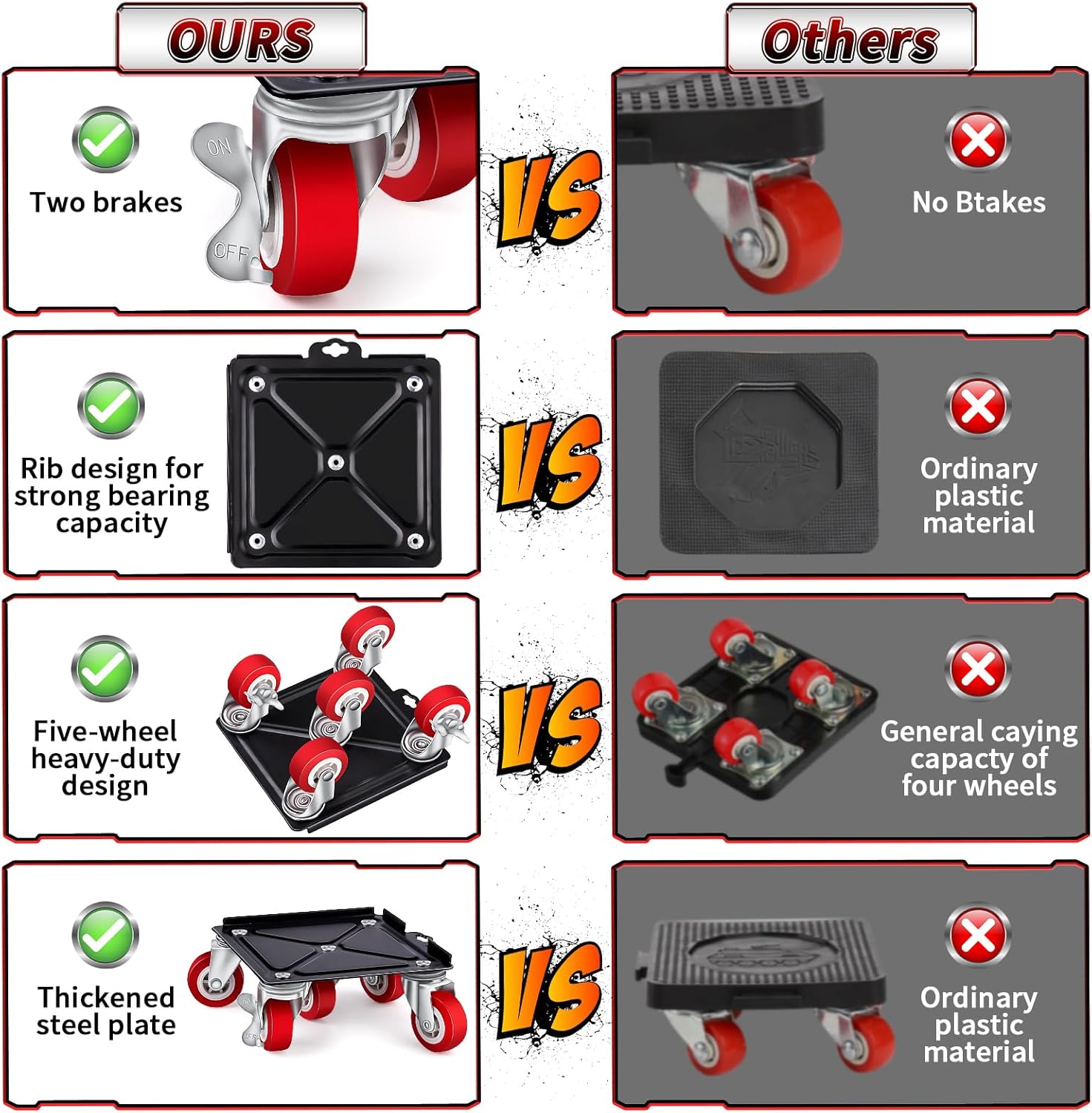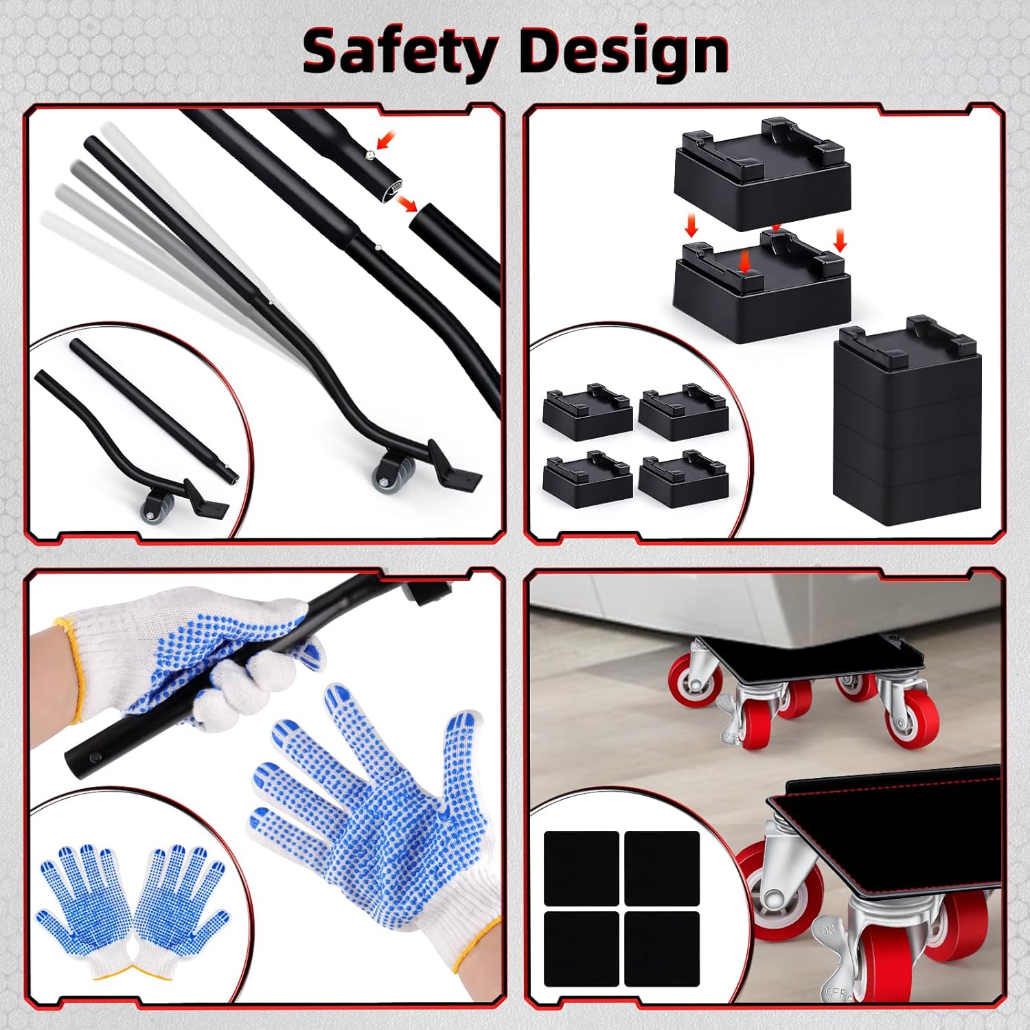 • 【All-in-One Set】:Upgraded large moving appliance dolly tool set,furniture movers with 5 wheels 360° rotatable and lockable,includes four 6.5 x 6.5 in moving dolly,1 x pry bar,4 x heightening spacers,4 x flannel non-slip mats,1 x pair of safety gloves,1 drawstring storage bag.
