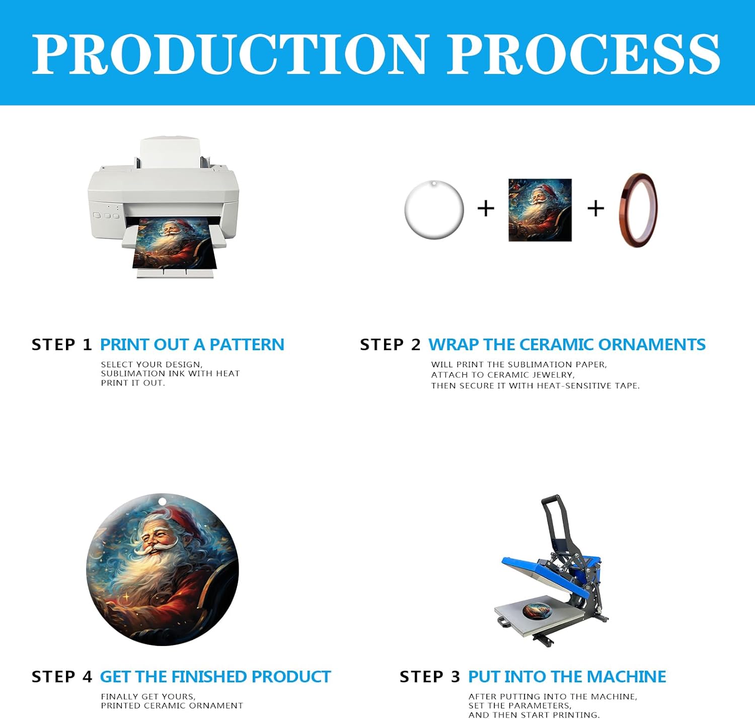 • 【Production process】Sublimation any personalized image on ceramic Ornament; Pressing temperature :180-190 ° C (356-374°F); Pressing time :240-260 S.