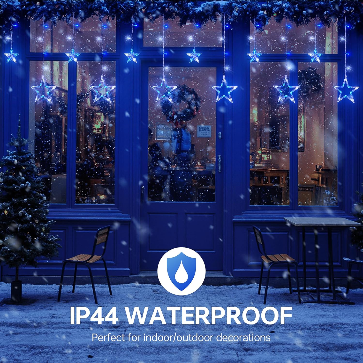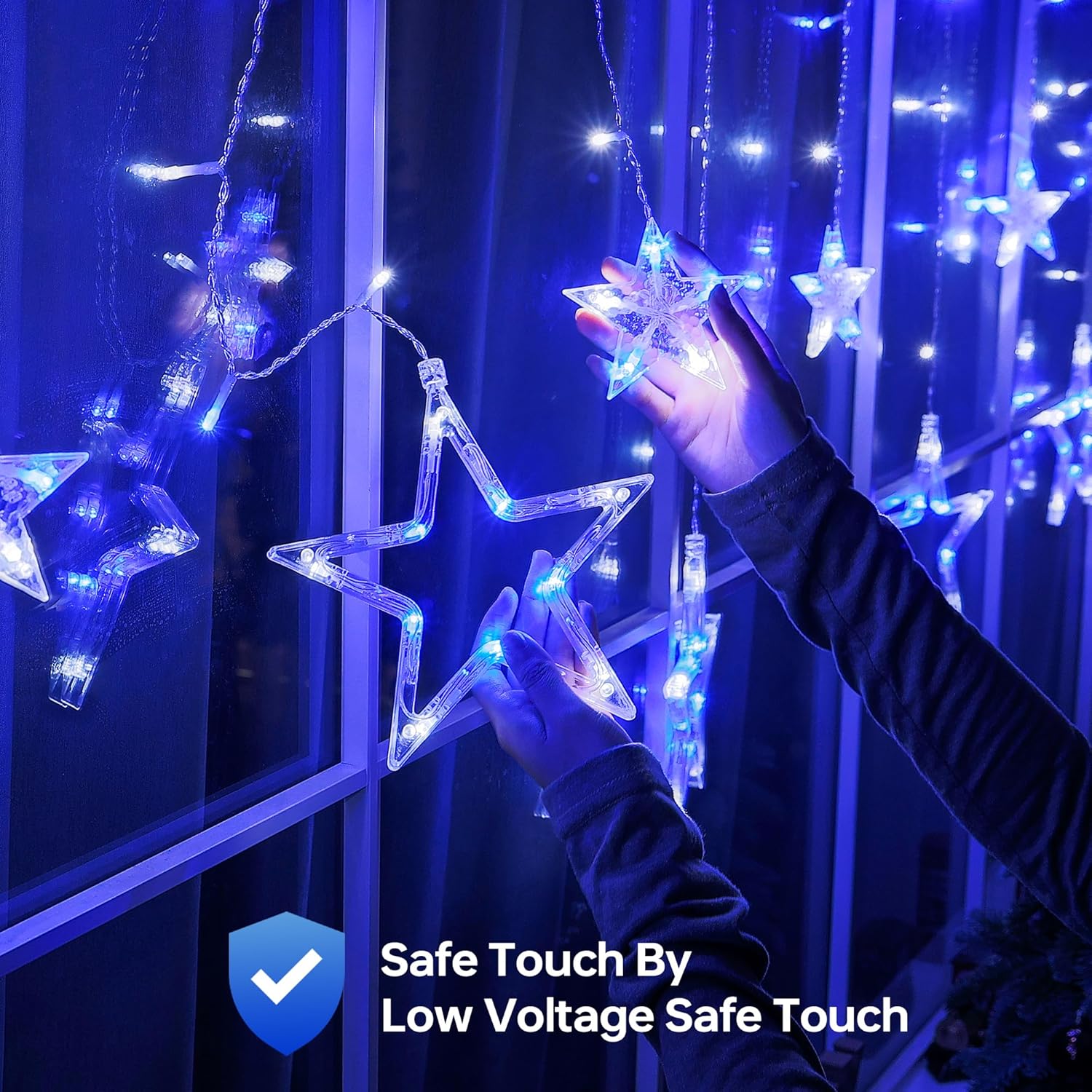 • Blue and white Christmas icicle lights with star:MYGOTO 126 bright blue and white LED Christmas curtain Lights with pure copper transparent wire is 8.2 feet long.12 Stars (6 large +6 small), the diameter of the large star is 7.3inch,the small star is 3.5inch. Hanging them from a house, or from a fence create a winter wonderland that attracts Santa and fairies,bring you a lot of festive atmosphere.