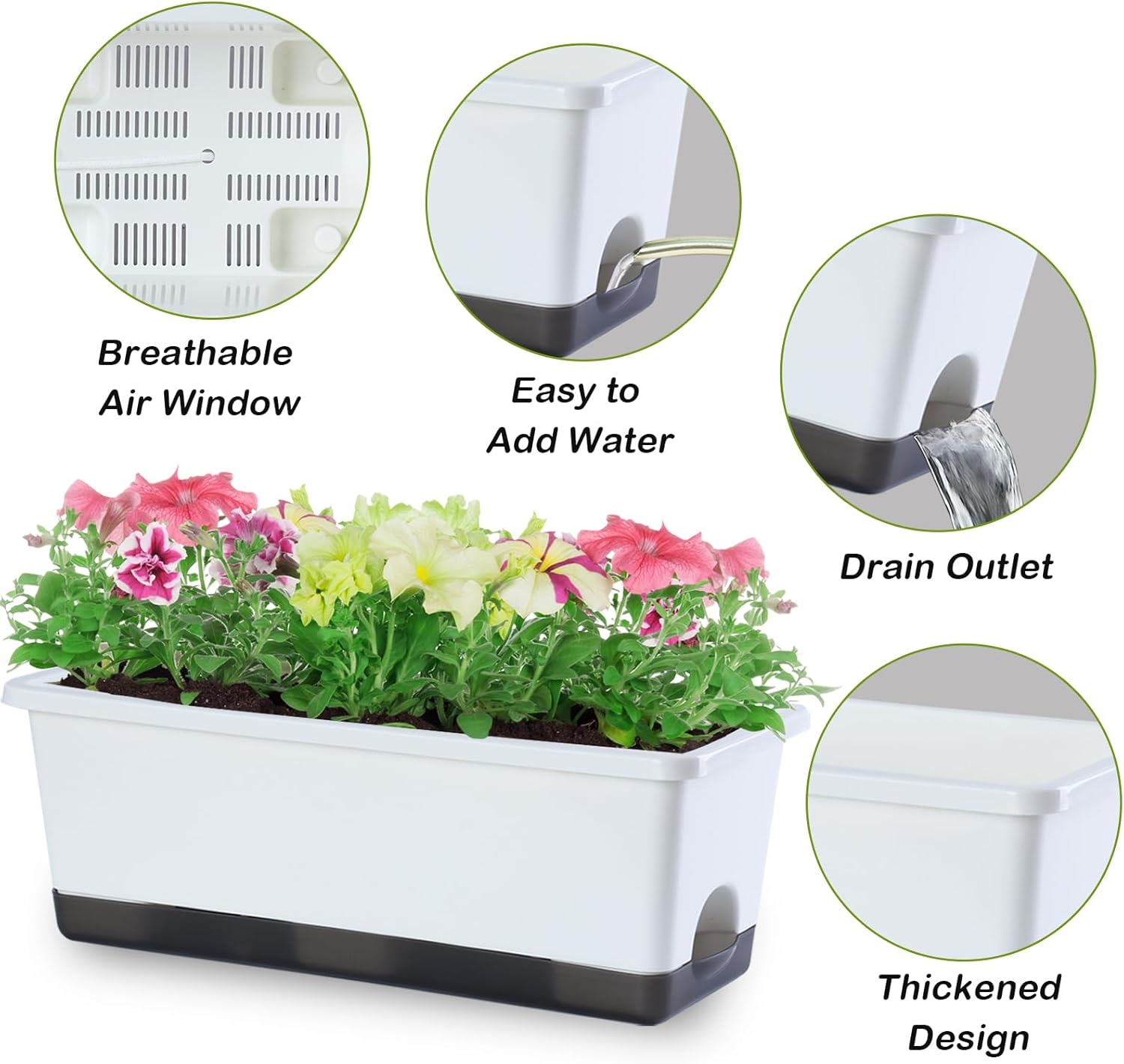 • 【Premium & Durable】The planter pots are made of high quality PP material and has been thickened to bear up to 150KG (330LB). This window box planter is sturdy, wear-resistant and durable. It can be exposed to light, wind, and sunlight for long periods of time, with a lifespan of decades. It is an excellent planter box for both indoor and outdoor.