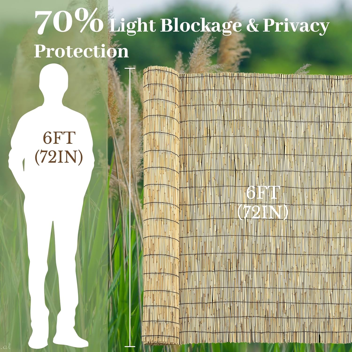 • Product Features: The bamboo reed fence rolls are 6 feet high and unfold to a length of 16.4 feet. They are designed to conceal unsightly bins, fences, or other objects, while also enhancing privacy for backyards, balconies, patios, or swimming pools