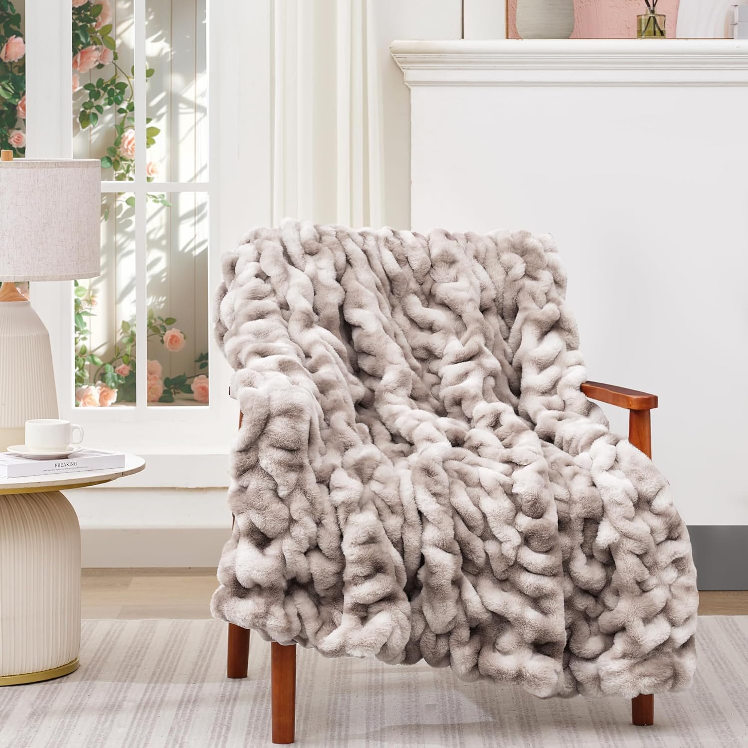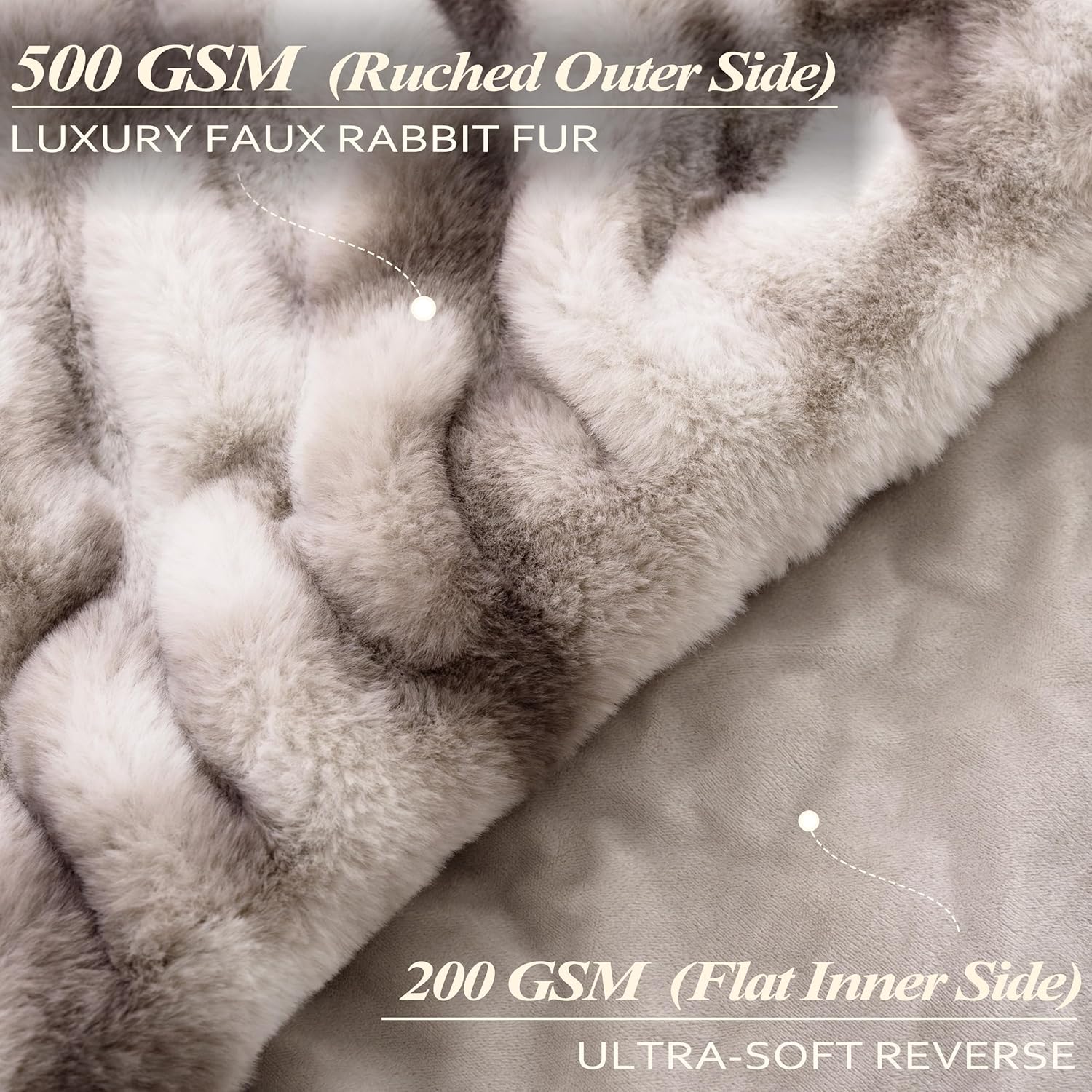 • Luxurious Comfort and Design: Experience exceptional comfort with our faux fur blanket, featuring 500 GSM ruched faux rabbit fur on the outer side and 200 GSM ultra-soft flat inner side. The unique ruched design adds a touch of elegance and visual interest, making it a beautiful addition to room. Its plush texture provides a velvety feel that's irresistibly soft to the touch
