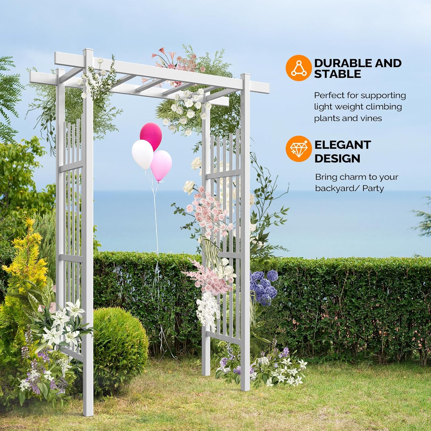 • Elegant Arch: Elegant white is suitable for weddings, classy parties and just about any occasion. Whether standing alone or covered with climbing vines and flowers, these outdoor arch add a striking focal point to your event. Adding grace and prominence to any outdoor venue with the Arbor features squared lattice side panels