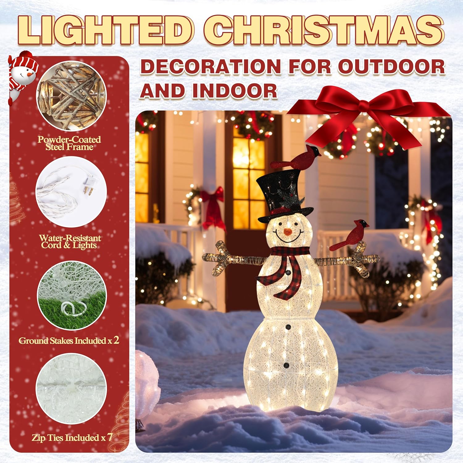 • [3D Pre-Lit Snowman] This light up Christmas snowman decoration is a 3D yard shape which is wearing a Christmas hat with red birds and a scarf. They are opening arms to welcome your family and friends with sincere smile. The 3D design makes the snowman looks more vivid as a indoor or outdoor Xmas Decor.