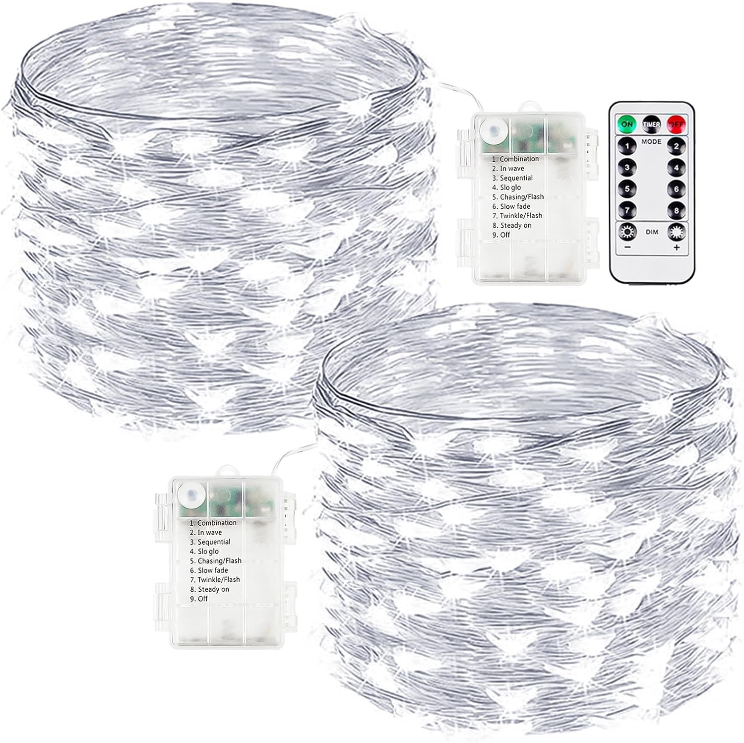 • Upgraded Christmas twinkle lights: Designed with ultra-bright LEDs and durable silver wire, these battery fairy lights are built to last and make an excellent choice for decorating bedrooms, centerpieces, balconies, and porches. Each set includes 2 strands of lights and 1 remotes, each 33ft long with 100 LEDs, powered by 3 AA batteries (not included)