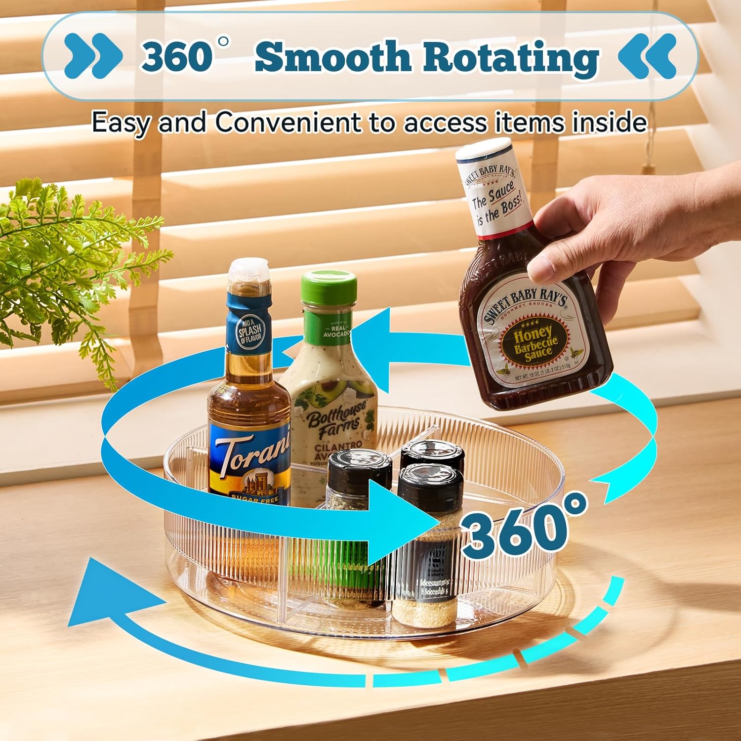 • 360° ROTATABLE EASY TO REACH: The Lazy Susan rotates 360 degrees smoothly and silently, eliminating the hassle of reaching into deep cabinets. The raised rim prevents items from sliding off while it spins, and the clear circular design with clear sides for easy viewing.