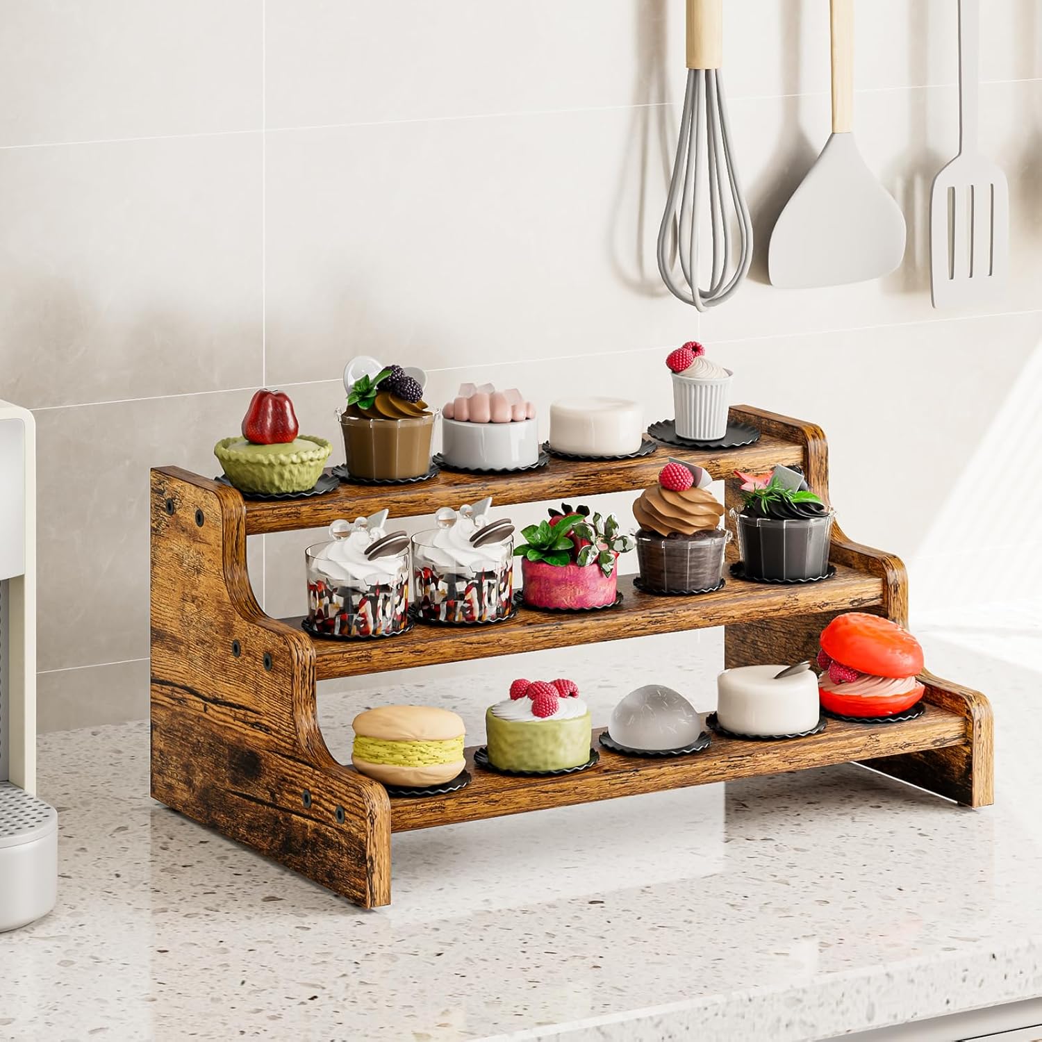 • STYLISH ACCENT: With its rustic brown finish, this step shelf adds a touch of warmth and charm to your kitchen décor.