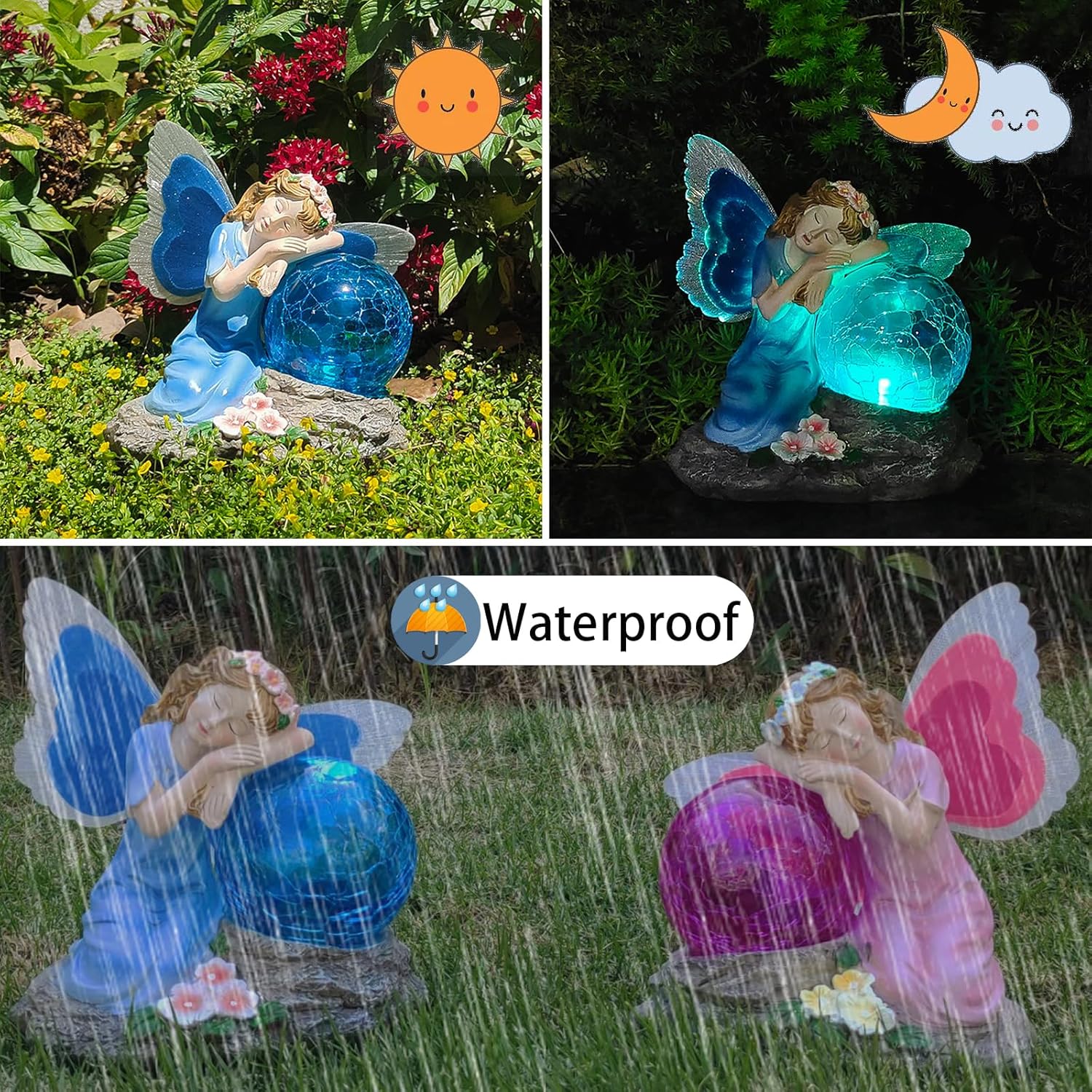 • Enhance your outdoor and garden with enchanting solar fairy decor. Wings and glass spheres glow with colorful colors at night! perfect for garden ornaments for outside garden and fairy garden accessories outdoor.