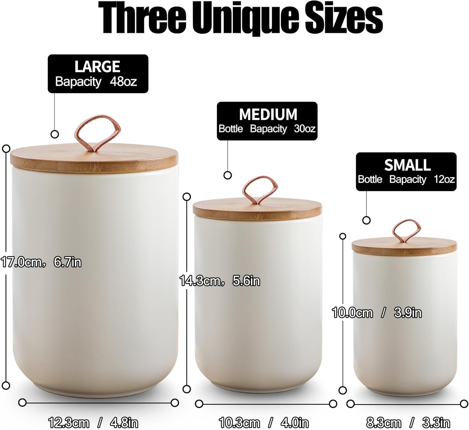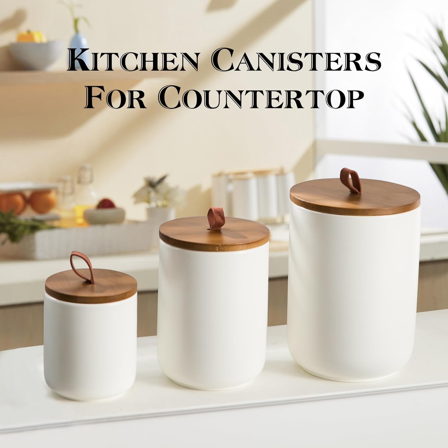 White Ceramic Canister Set with Wooden Lid, 3-Piece Food Storage Jars for Kitchen Counter, Storage Container for Coffee, Tea, Spice, Sugar, Grains, Salt