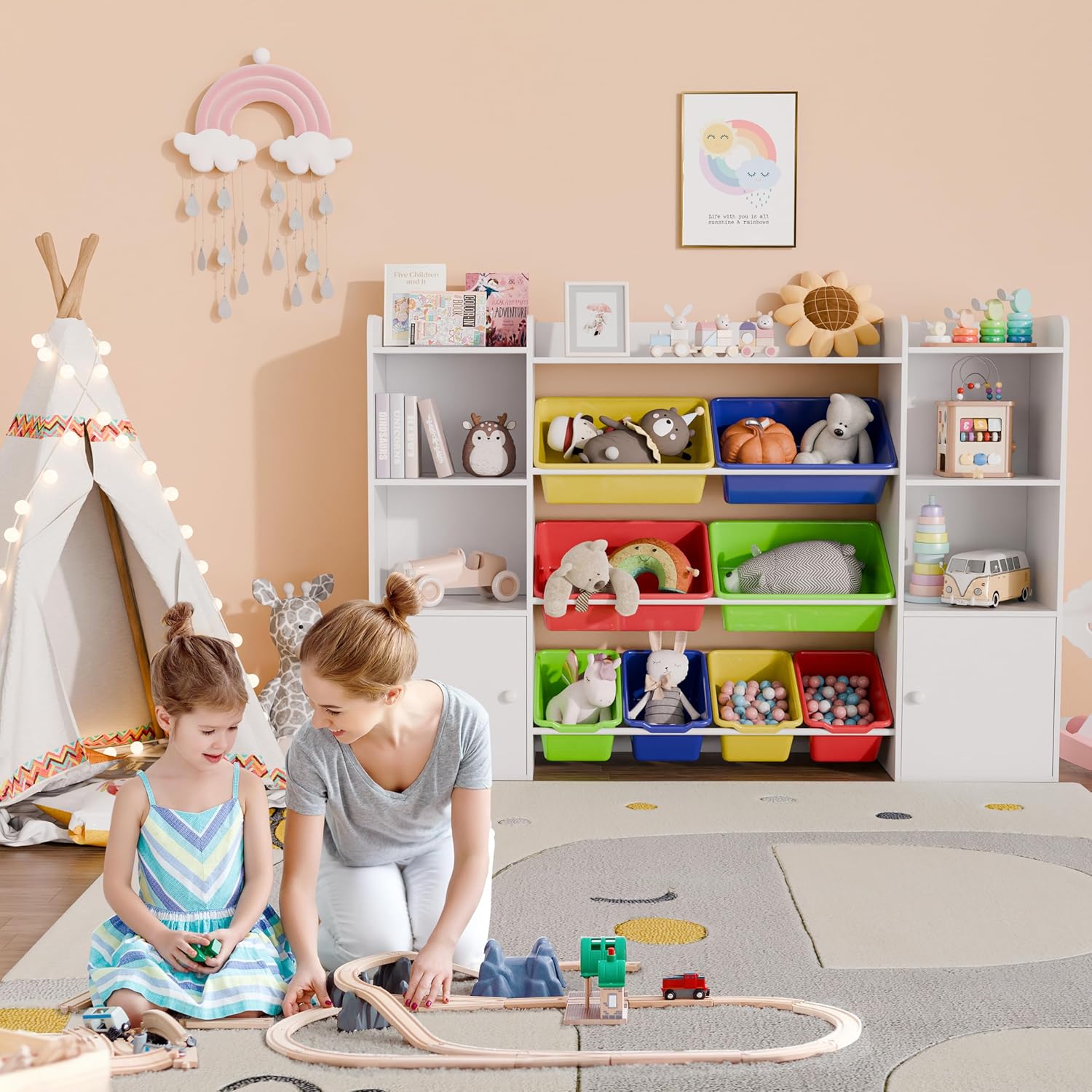 • Modern Appearance - The kids room organization complemented by colorful toy bins create a stylish atmosphere. Not only does it allow for a neat and organized display of toys, but it also helps your child easily find their desired toy or book. Perfect for bedroom, living room, playroom, kindergarten, nursery, and children's classroom.